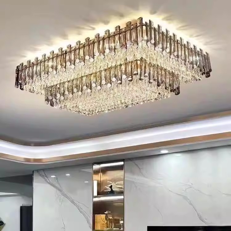 Elevate your interior with the dazzling brilliance of our Luxury Crystal Ceiling Light. This show-stopping fixture features a sleek, circular (or rectangular) frame adorned with layered, smoky gray and clear crystal prisms, creating a luminous, multi-dimensional silhouette that commands attention. The defining feature is the array of precision-cut crystals, which capture and refract internal LED light to produce a sparkling, jewelry-like effect throughout the room. Framed by a polished gold or chrome metal base, the fixture sits flush to the ceiling, making it the epitome of modern glamour—ideal for luxury living rooms, grand dining halls, or high-end hotel lobbies. As a dedicated lighting manufacturer, we can fully customize the shape, crystal colors, and metal finish to perfectly match your project's scale and style.