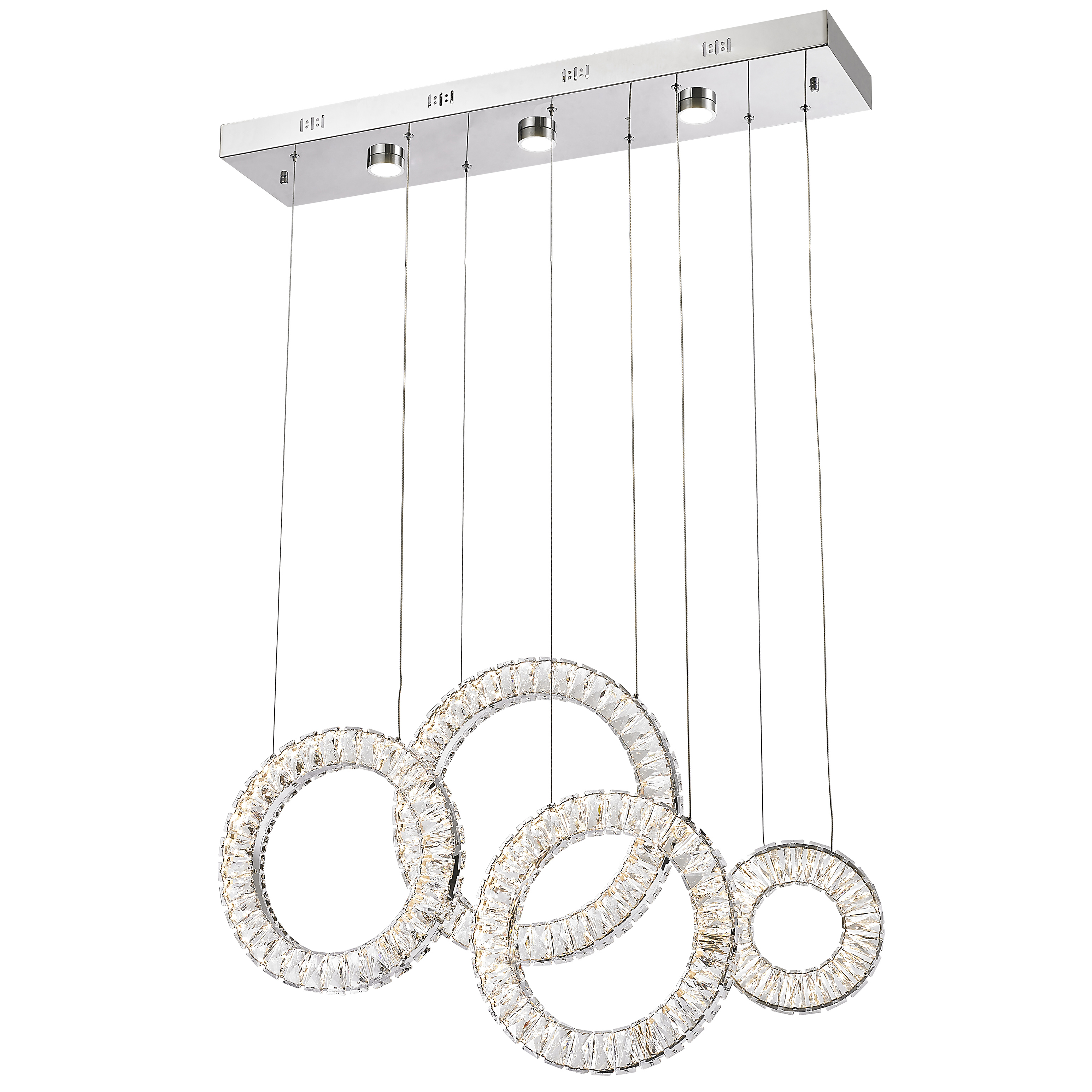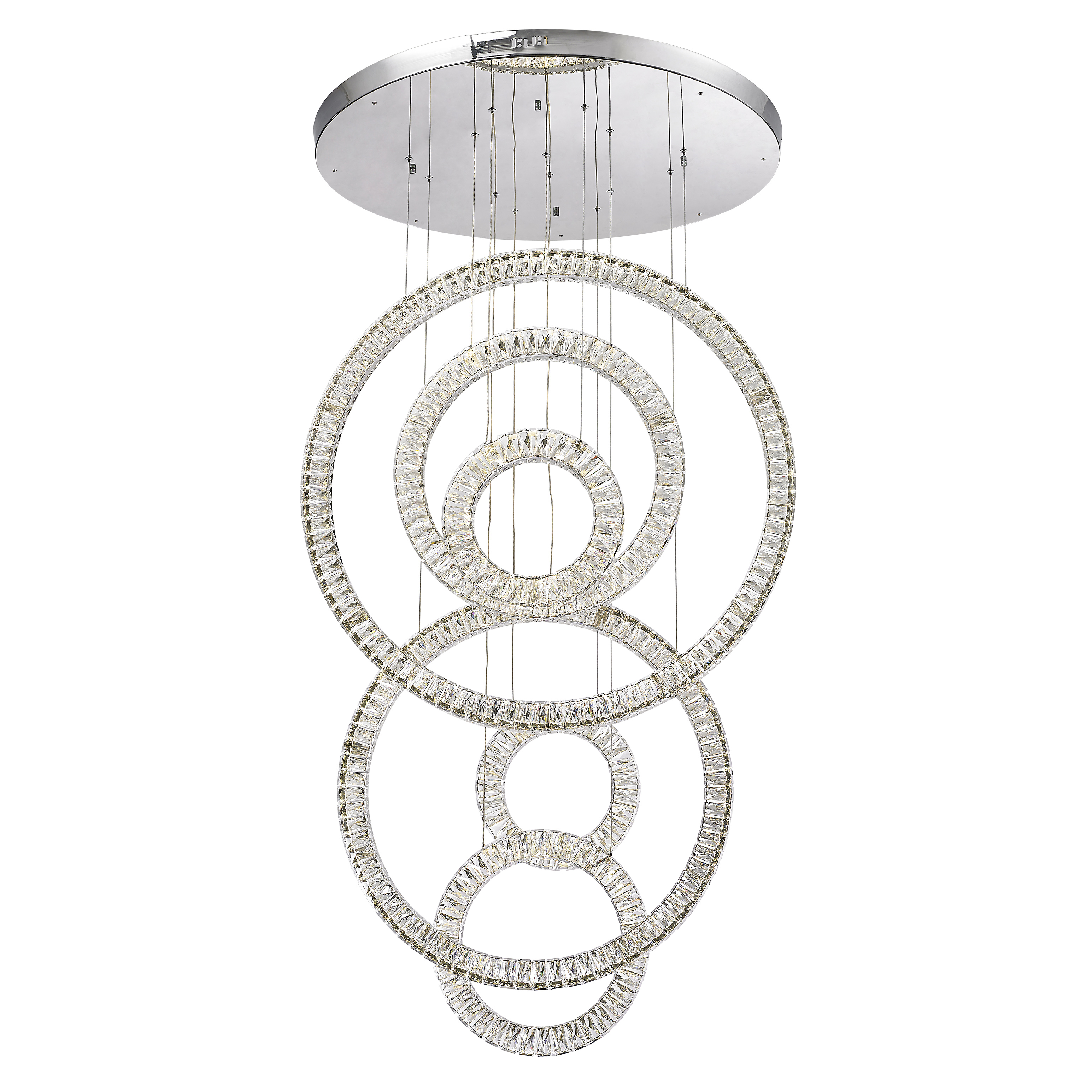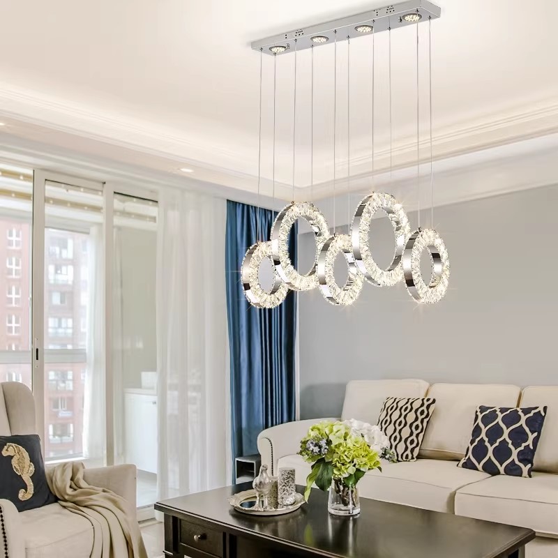 This minimalist crystal LED chandelier features a sleek brushed stainless steel base and 4/5 interlocking K9 crystal rings, creating a modern, layered focal point. Adjustable suspension cables let you customize the height, while energy-efficient LED chips deliver bright, even illumination with a 3000K–6000K color temperature range. Ideal for dining rooms, living rooms, and open-concept interiors, it blends clean lines with understated luxury, elevating any contemporary space with durable, rust-resistant materials and flicker-free light.