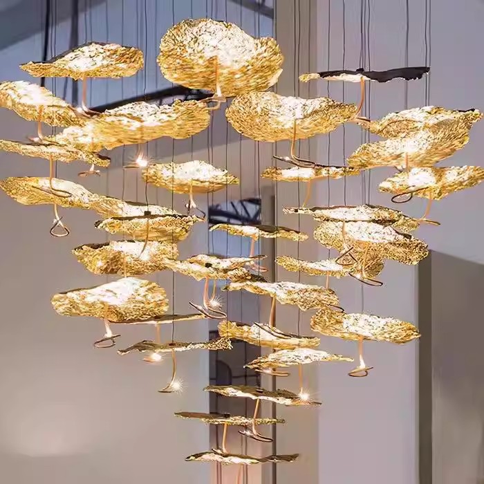 Elevate your interior with the artistic allure of our Modern Luxury Custom Gold Leaf Chandelier. This stunning fixture features a cascading arrangement of intricately designed gold leaf elements, suspended at varying heights to create a sense of gentle movement and depth. Crafted from premium materials with a luminous gold finish, each leaf emits a soft, warm glow, casting a diffused light that enhances the luxurious ambiance of any space. The organic, nature-inspired design seamlessly integrates with a wide range of decor styles, from modern luxury to contemporary sophistication. Ideal for high-end hotels, opulent villas, and grand staircases, this custom chandelier is a striking focal point that transforms ordinary spaces into extraordinary experiences. As a dedicated lighting manufacturer, we specialize in non-standard customization—from size and shape to color and finish—to perfectly match your project’s unique vision. This statement chandelier delivers timeless style and unparalleled craftsmanship, making it the ultimate choice for creating unforgettable first impressions.