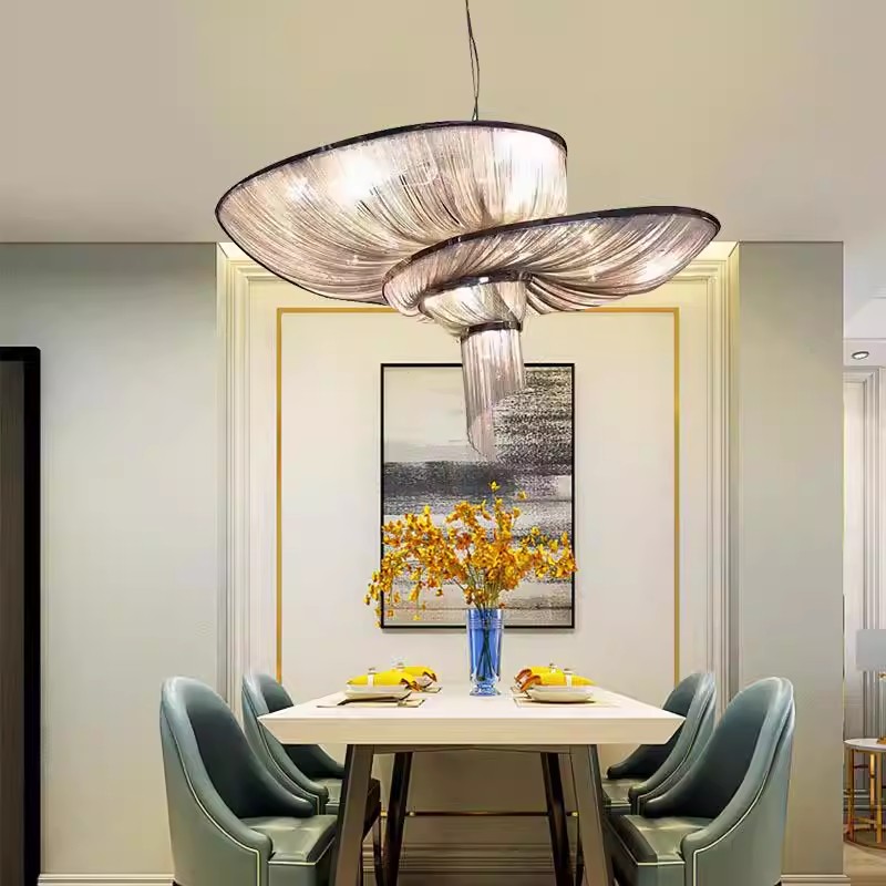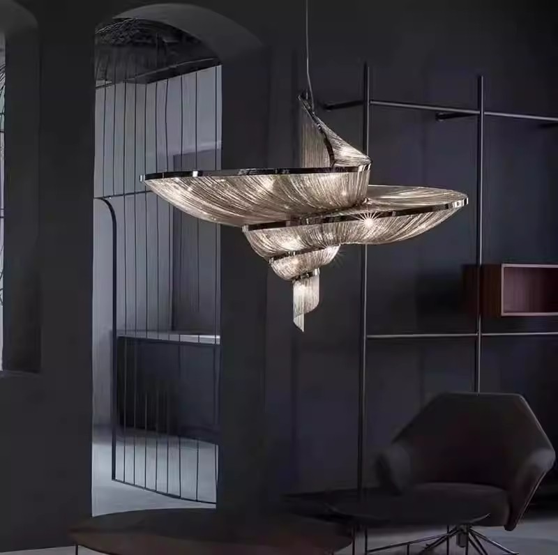 Elevate your interior with the ethereal elegance of our Floating Silk Chandelier. This show-stopping fixture features a fluid, layered arrangement of translucent, silk-like strands, creating a sculptural, cloud-like silhouette that commands attention. The defining feature is the delicate, iridescent strands, which capture and diffuse internal light to produce a soft, ambient glow with a mesmerizing, watercolor-like effect throughout the space. Framed by a sleek black metal edge and suspended by a thin wire, the layered forms appear to float effortlessly, making this fixture the epitome of modern luxury—ideal for dining rooms, living areas, or high-end commercial interiors. As a dedicated lighting manufacturer, we can fully customize the strand colors, arrangement, and overall dimensions to perfectly match your project’s scale and style.