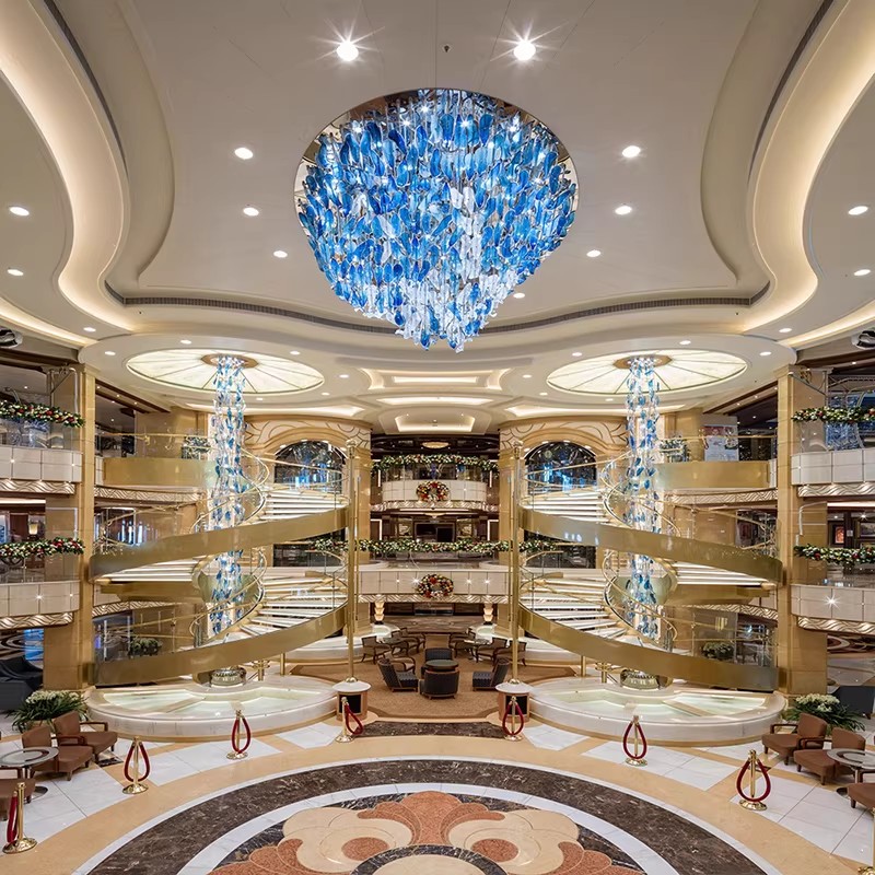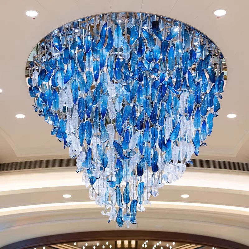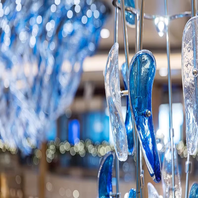 Elevate your interior with the captivating allure of our Blue Glass Leaf Chandelier. This show-stopping fixture features a cascading, organic arrangement of handcrafted glass leaves in rich blue and translucent white tones, creating a dynamic, wave-like silhouette that commands attention. The defining feature is the textured, iridescent glass elements, which capture and refract internal light to produce a shimmering, aquatic-inspired effect throughout the space. Suspended from a sleek ceiling mount, the layered leaves appear to float effortlessly, making this fixture the epitome of artistic luxury—ideal for upscale restaurants, luxury hotel lobbies, or contemporary commercial interiors. As a dedicated lighting manufacturer, we can fully customize the leaf colors, arrangement, and overall dimensions to perfectly match your project’s scale and style.