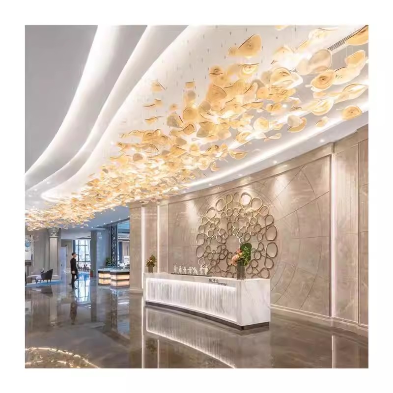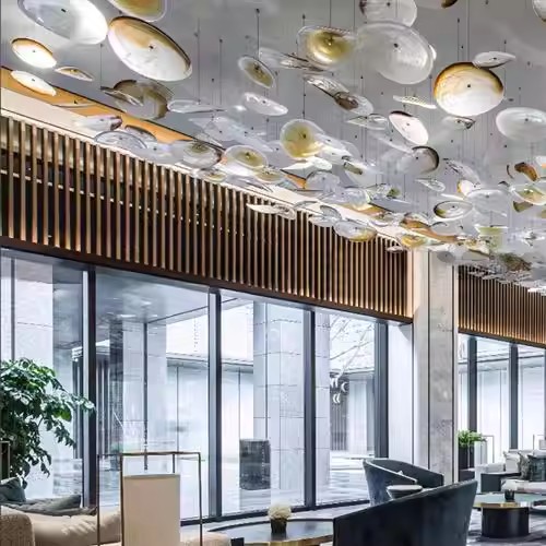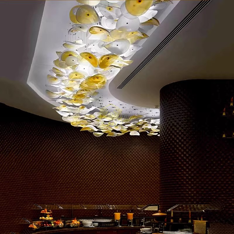 Elevate your interior with the artistic allure of our Artistic Glass Disc Chandelier. This show-stopping fixture features a dynamic, organic arrangement of translucent glass discs in warm amber and clear tones, creating a cascading, cloud-like silhouette that commands attention. The defining feature is the handcrafted glass elements, which capture and diffuse internal light to produce a soft, ambient glow with a mesmerizing, watercolor-like effect throughout the space. Suspended from a sleek ceiling mount, the layered discs appear to float effortlessly, making this fixture the epitome of modern artistic design—ideal for luxury hotel lobbies, upscale restaurants, or contemporary commercial interiors. As a dedicated lighting manufacturer, we can fully customize the disc colors, arrangement, and overall dimensions to perfectly match your project’s scale and style.