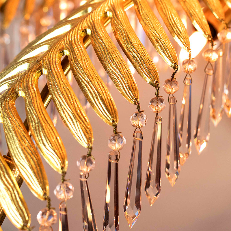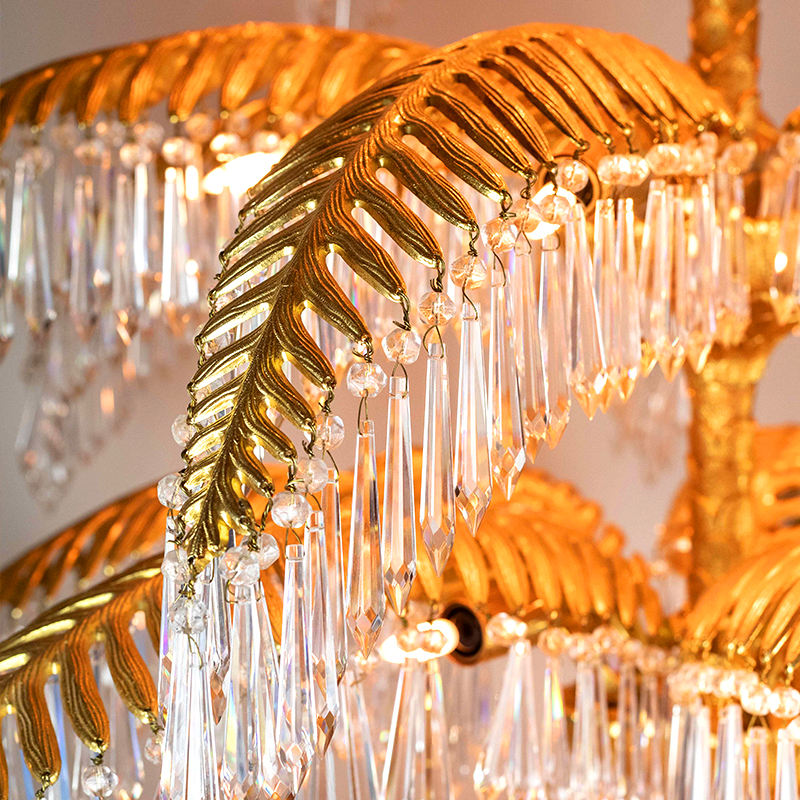 Elevate your grand interior with the opulent artistry of our Golden Palm Tree Crystal Chandelier. This show-stopping fixture features a majestic, multi-tiered palm tree structure, crafted from polished gold-toned metal, with each frond adorned with cascading strands of precision-cut crystal, creating a luminous, tropical-inspired silhouette that commands attention. The defining feature is the flawless crystal, which captures and refracts internal LED light to produce a dazzling, jewel-like effect throughout the space. Suspended from a sleek ceiling mount, this fixture is the epitome of luxury—ideal for grand foyers, luxury villas, or as a striking centerpiece in high-end commercial spaces. As a dedicated lighting manufacturer, we can fully customize the height, frond arrangement, and metal finish to perfectly matc.