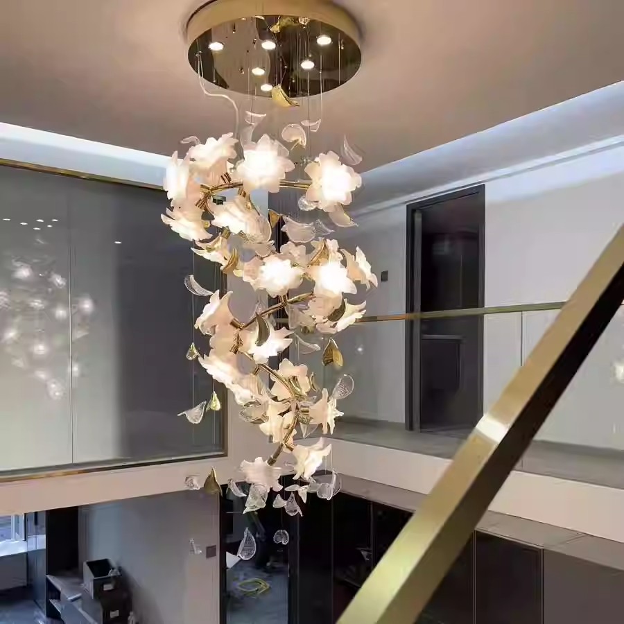 Elevate your multi-level space with the enchanting allure of our Blooming Splendor Floral Chandelier. This show-stopping fixture features a cascading, organic arrangement of delicate frosted white glass blossoms, supported by curving gold-toned metal branches, creating a luminous, nature-inspired silhouette that commands attention. The defining feature is the milky white glass petals, which diffuse internal LED light to produce a soft, ambient glow with a mesmerizing, blooming effect throughout the space. Suspended from a sleek, polished ceiling plate, the fixture is the epitome of artistic luxury—ideal for grand staircases, LOFTs, or duplex apartments. As a dedicated lighting manufacturer, we can fully customize the number of blossoms, branch arrangement, and metal finish to perfectly match your project’s scale and style.