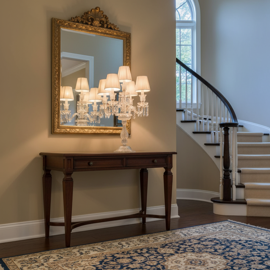 Elevate your bedroom or living space with the timeless opulence of our 5-Light Crystal Chandelier Table Lamp. This show-stopping fixture features an ornate, chandelier-inspired design, crafted from a polished silver-toned metal frame, adorned with cascading crystal pendants and topped with five soft white fabric shades, creating a luminous, grand silhouette that commands attention. The defining feature is the precision-cut crystal, which captures and refracts internal light to produce a warm, ambient glow with a dazzling, jewel-like effect throughout the space. Paired with a sleek, stable base, it balances aesthetic charm and functional design. Equipped with a wired power supply and convenient switch control, this lamp is the epitome of classic luxury—ideal for adding a touch of elegance to bedroom bedside tables and living room side tables. As a dedicated lighting manufacturer, we can fully customize the finish to perfectly match your decor.