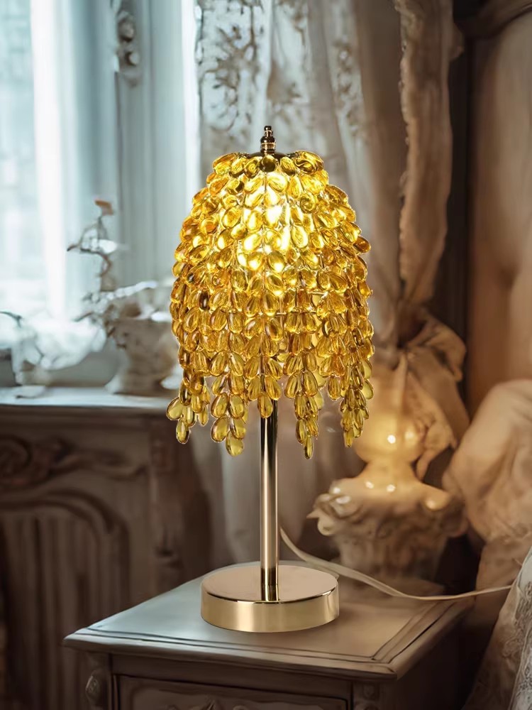Elevate your bedside or living area with the opulent glow of ourLuxury Crystal Tassel Table Lamp. This showstopping fixture features a cascading shade of transparent crystal beads, finished with a warm yellow gradient sheen that mimics a shower of starlight for unmatched translucency. Its defining feature is the precision-cut crystal, which refracts light to cast delicate, mesmerizing patterns throughout the room. Crafted for both beauty and stability, it pairs a sleek metal stem with a classic retro copper base. An independent switch on the power cord ensures effortless operation, making it the ultimate luxury accent for bedrooms and living rooms alike.