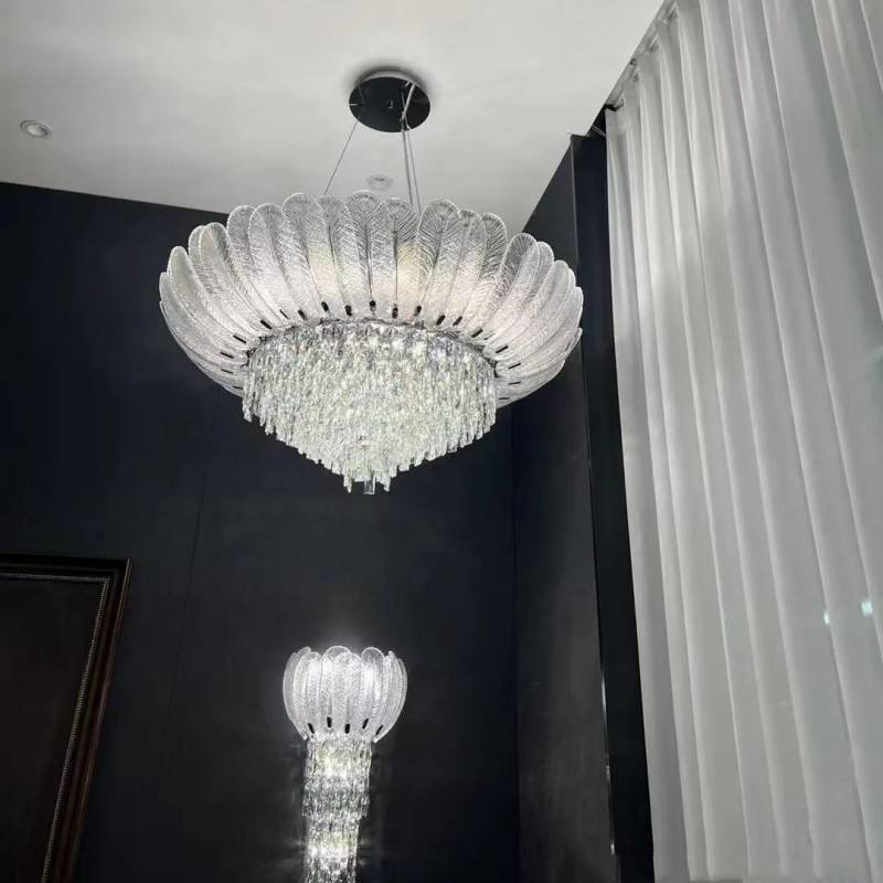 Elevate your interior with the ethereal allure of our Modern Luxury Custom Feather Glass Crystal Chandelier. This breathtaking fixture features a circular, crown-like design, crafted from intricately textured, feather-shaped glass panels that form a delicate, layered silhouette. Cascading from the center is a dense cluster of clear, faceted crystal rods, which refract light to cast a warm, ambient glow. The organic, nature-inspired design seamlessly integrates with a wide range of decor styles, from modern luxury to contemporary sophistication. Ideal for high-end hotels, opulent villas, and grand dining rooms, this custom chandelier is a striking focal point that transforms ordinary spaces into extraordinary experiences. As a dedicated lighting manufacturer, we specialize in non-standard customization—from dimensions and shape to color and finish—to perfectly match your project’s unique vision. This statement chandelier delivers timeless style and unparalleled craftsmanship, making it the ultimate choice for creating unforgettable first impressions.