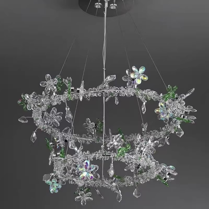 Elevate your modern living space with the ethereal luxury of our Crystal Floral Ring Chandelier . This exquisite fixture features a delicate, layered ring design, adorned with intricate crystal flowers, vines, and teardrop pendants that catch and refract light to create a soft, luminous glow. The integrated LED lights emit a warm, inviting illumination, while the crystal details add a touch of glamour and sophistication. With a wide voltage range of 111V-240V, it is perfectly compatible with North American electrical systems. Ideal for living rooms, bedrooms, and dining areas, this chandelier transforms any space into a dreamy, elegant retreat, blending modern luxury with a whimsical, nature-inspired aesthetic.