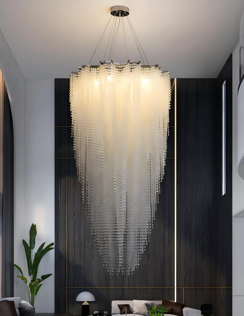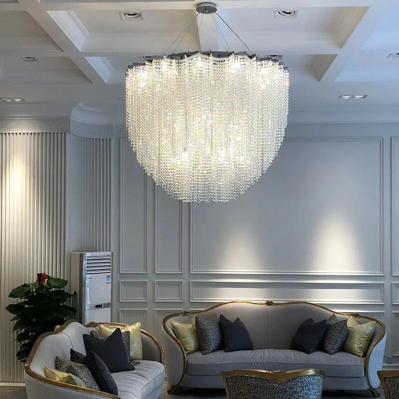 This luxurious crystal chandelier features a polished chrome frame and ceiling plate, with cascading layers of clear faceted crystals arranged in a soft bowl or teardrop silhouette. The chrome metal structure delivers a sleek, modern sheen, while the crystal strands refract light into a brilliant, shimmering glow, filling the space with elegant radiance. Designed to elevate high-ceilinged interiors, it blends classic crystal opulence with contemporary minimalism, making it a stunning focal point for villas, luxury hotels, ballrooms, and upscale living rooms, perfectly balancing grandeur and refined style.