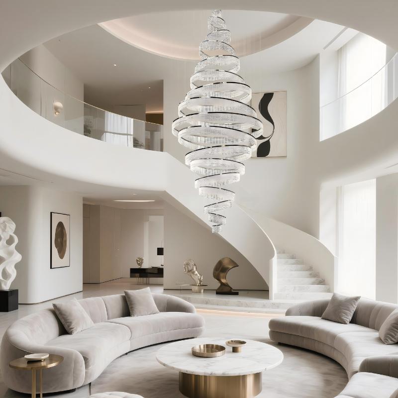 This multi-tier crystal chandelier features a polished chrome metal frame, paired with cascading layers of clear faceted crystals to form a grand stepped silhouette. The sleek silver-toned metal frame delivers a refined modern sheen, while the crystals refract light into a brilliant iridescent glow. Blending contemporary luxury with timeless crystal opulence, it is designed for high-ceilinged spaces, making it a stunning focal point for villas, hotel lobbies, and duplex living rooms to elevate the space’s luxurious ambiance.