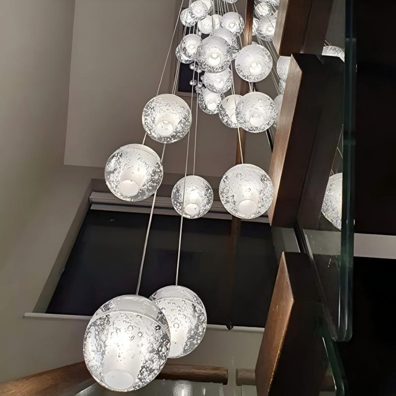 This bubble glass staircase chandelier features dozens of hand-blown clear bubble glass spheres, whose irregular internal bubble textures cast a dreamy glow when light refracts through. Thin stainless steel wires suspend the glass spheres in a staggered arrangement, paired with a silver metal base. It retains the crisp minimalism of modern design while infusing a dynamic natural artistic texture, making it a highly atmospheric focal point in duplex staircases, high-ceilinged living rooms, and upscale hotel lobbies, endowing vertical spaces with a light and transparent luxurious tone.