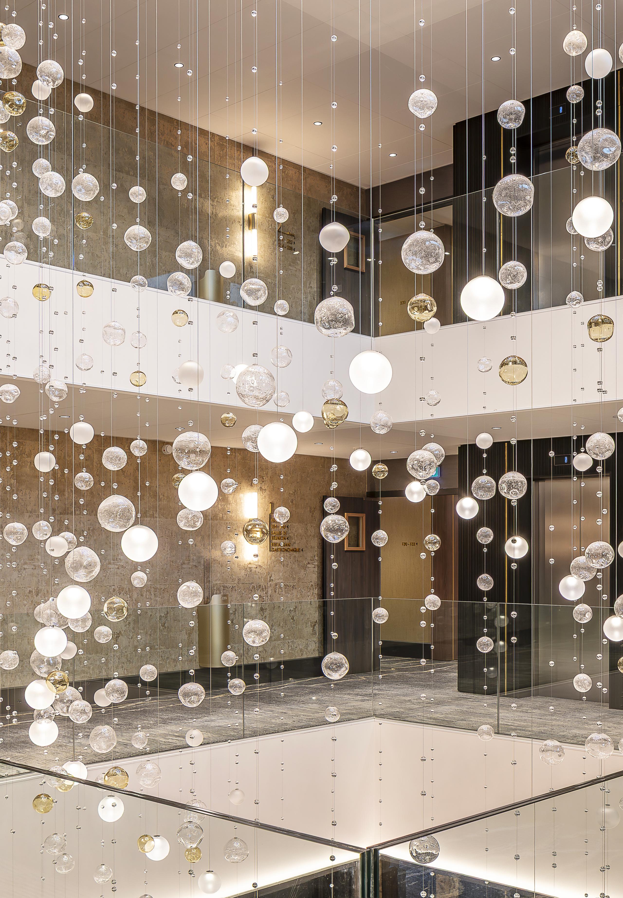 This bespoke pendant lighting unfolds like a cascade of glistening water pearls. Crafted from hand-blown glass elements in crystal clear, sandblasted bubble, and soft light amber finishes, these orbs descend gracefully from the ceiling toward the reception area below, shimmering with delicate, ethereal light. It merges the fluidity of nature with minimalist luxury, creating a light, transparent, and dreamlike atmosphere that elevates high-ceilinged spaces into a visual spectacle.