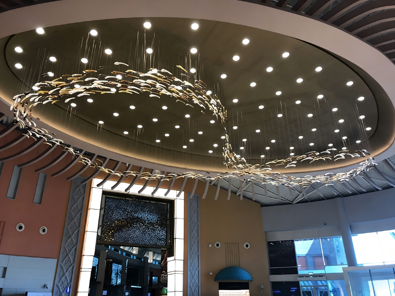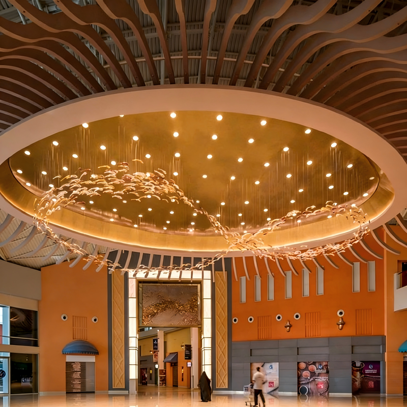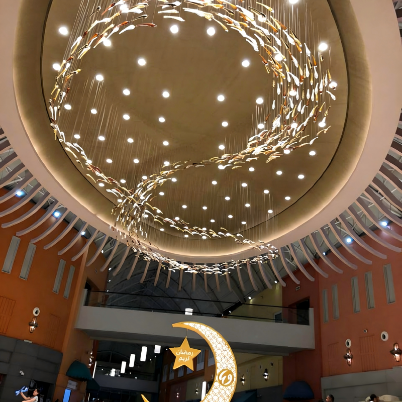 The chandelier echoes the graceful forms of fish gliding through water, with each component carefully crafted to create a floating, weightless effect that transforms the space into a shimmering visual journey. Composed of clear crystal glass elements paired with delicate light-cognac and cognac tones, the piece adds warmth, elegance, and depth—much like sunlight filtering through water. Together, these elements form a dynamic installation that captures movement and light in perfect harmony.