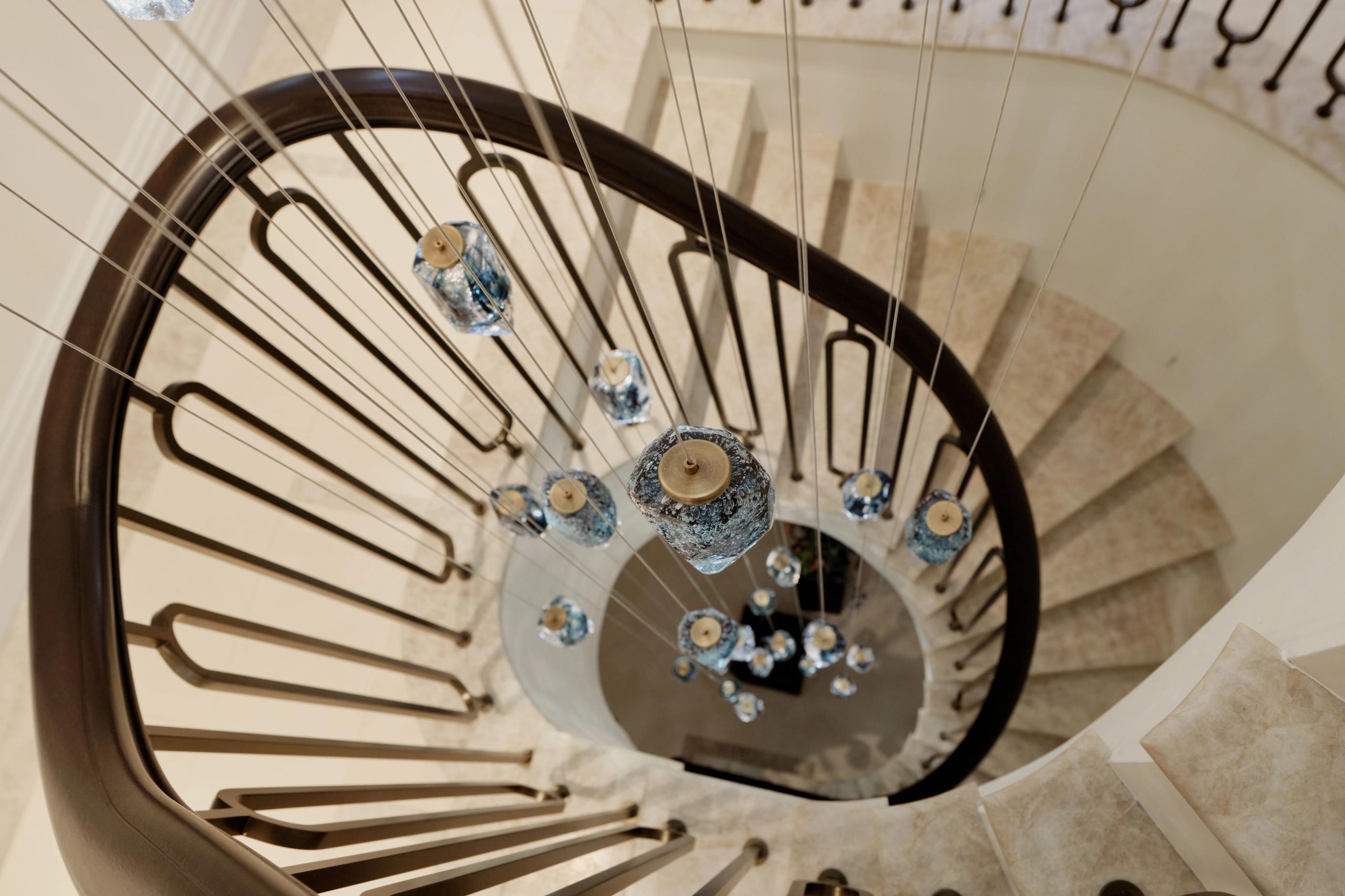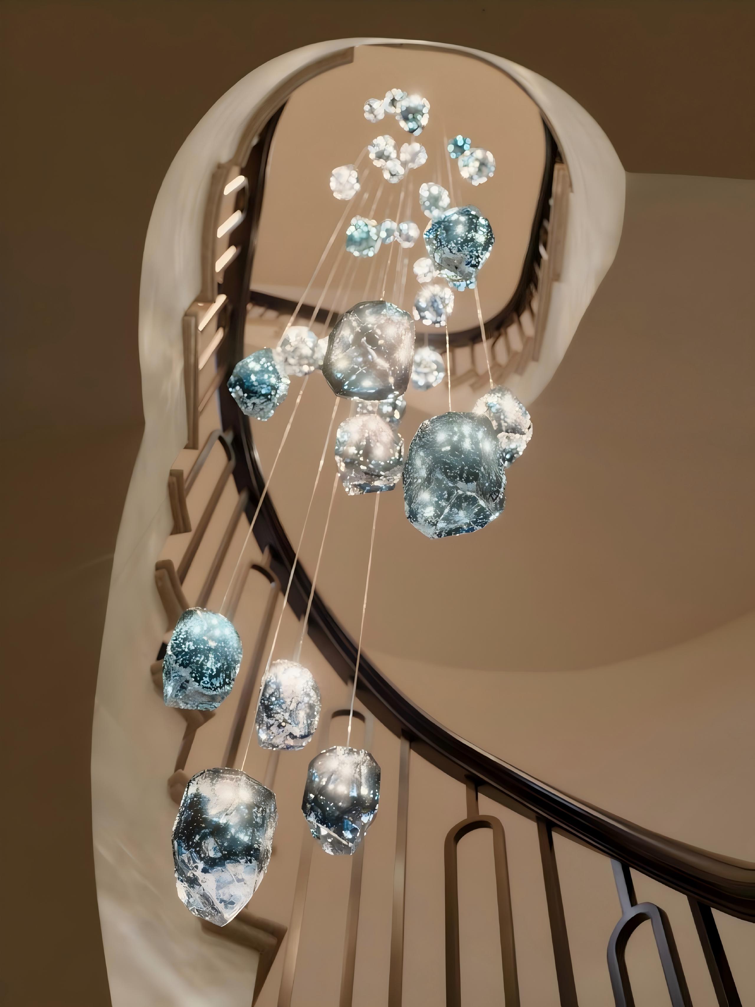 This Staircase Lighting features hand-blown soda-finished glass as its core, with a translucent lagoon mist hue that diffuses a gentle, water-wave-like glow under light. The internal bubble texture shimmers with light and shadow, resembling suspended ice crystals and flowing mist. Suspended by transparent nylon wires and anchored with brass gold metal caps, the glass pendants hang like stars over duplexes, villas, and staircases, infusing high-end spaces with a naturally dynamic, luxurious and elegant artistic atmosphere.