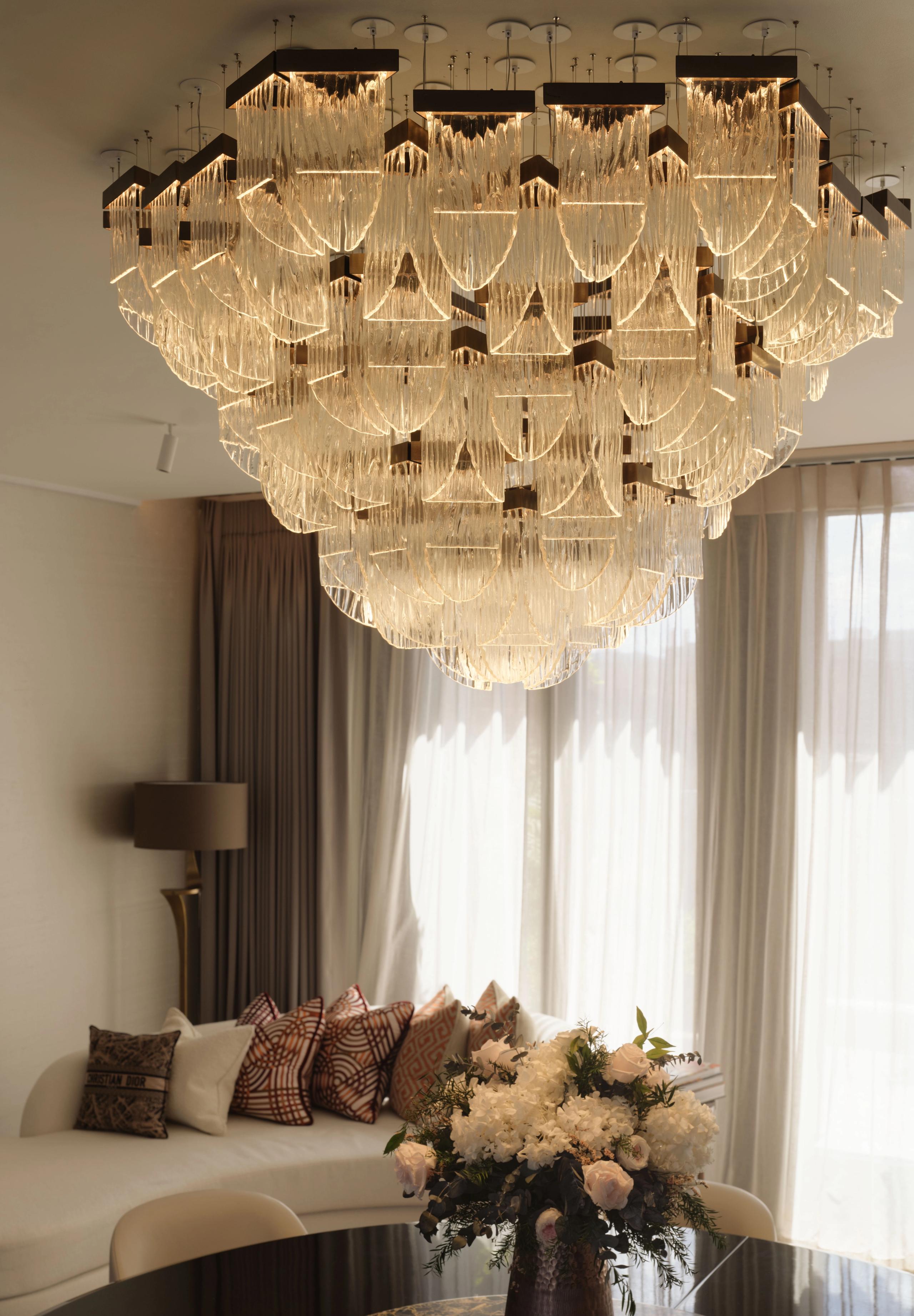This is a custom artistic chandelier made of high-quality slumped glass. The glass lampshades feature an organically cut shape and delicate texture, forming a bold geometric structure with a strong sculptural sense. It uses LED light source, soft and glare-free, casting elegant light and shadow reflections. With modern artistic style, this chandelier is ideal for dining rooms, hotel lobbies, banquet halls and luxury villas, serving as an eye-catching decorative centerpiece that combines modern aesthetics and artistic ambiance.