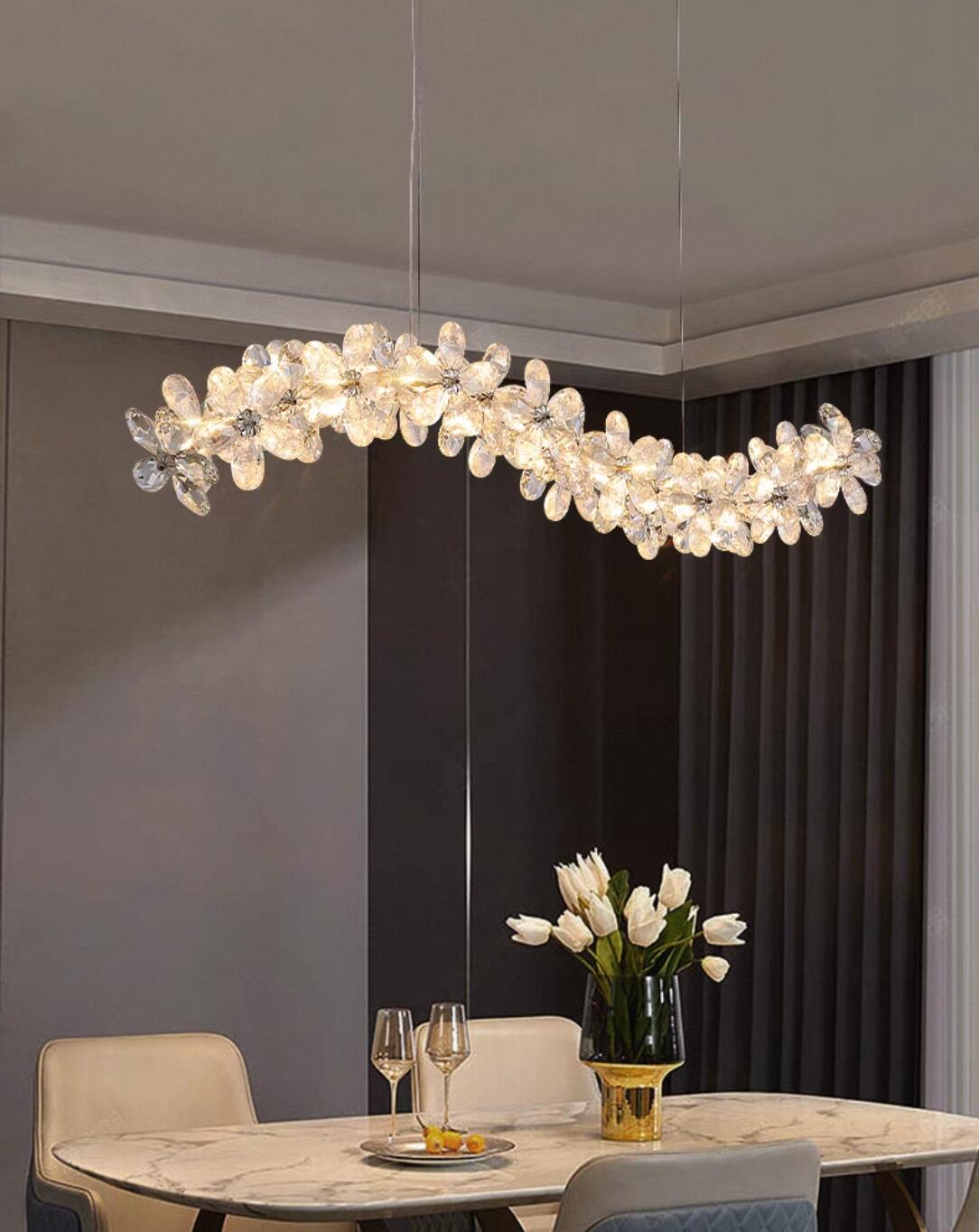 Crafted from crystal with three-dimensional petal forms, this chandelier features multi‑faceted precision cutting and high‑clarity polishing. When illuminated, it radiates a brilliant, flowing glow that instantly elevates the ambiance. Accented with glossy silver‑plated metal stamens, the design offers graceful, dynamic lines. Perfectly suited for dining rooms, living rooms, and various other spaces, it serves as the finishing touch for French light luxury interiors—combining both functional illumination and artistic decoration.