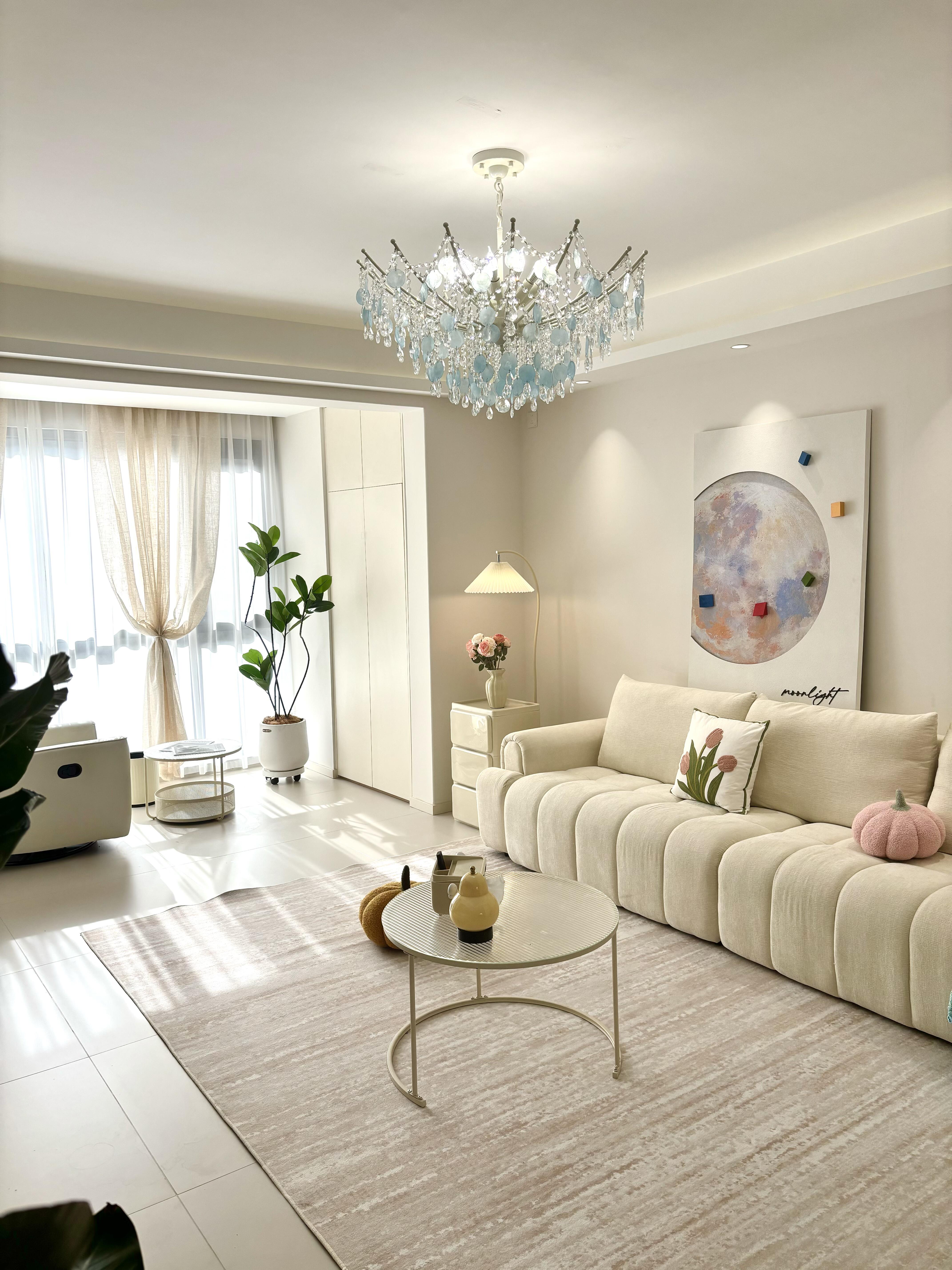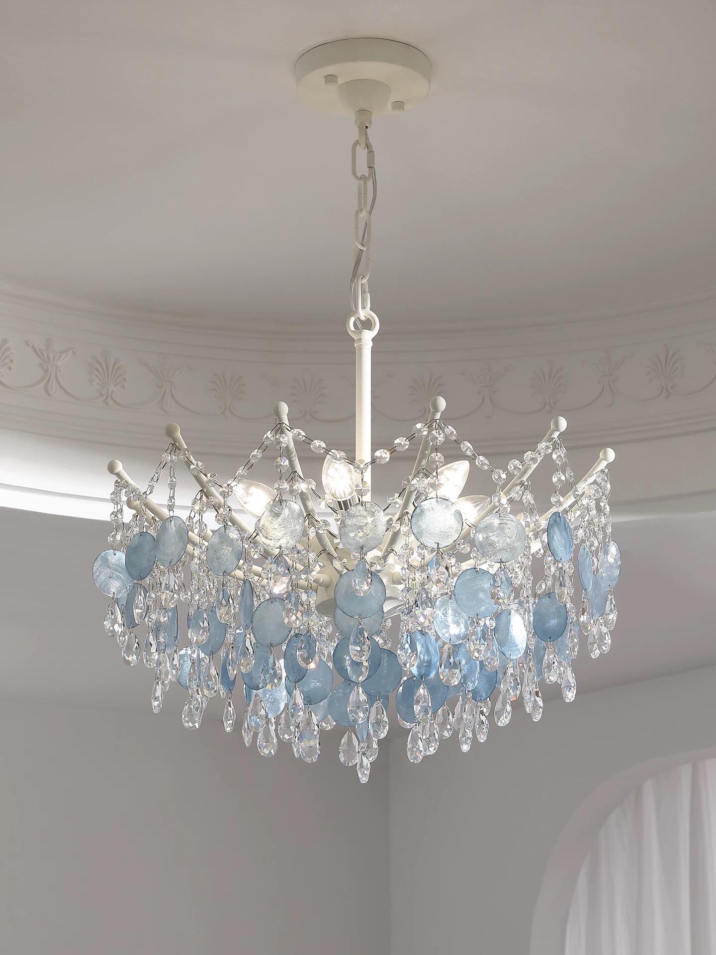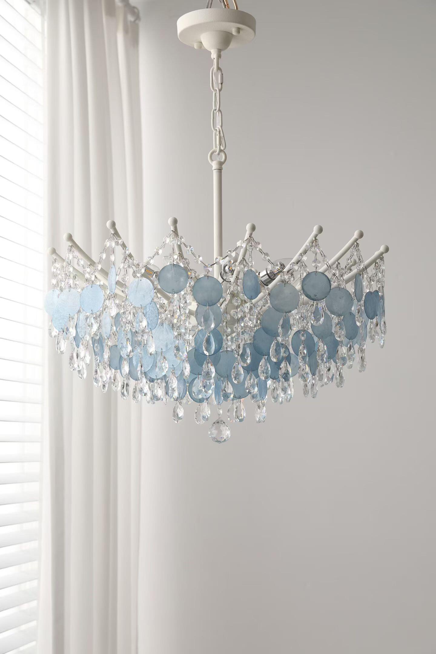 This French cream-style chandelier features a matte white powder-coated iron frame, adorned with matte ice-blue natural shell rounds and multi-faceted cut crystals, artfully arranged into a lush floral cluster. The natural iridescent texture of the shells, combined with the brilliant sparkle of the crystals, creates a soft, dreamy, and romantic glow when illuminated鈥攊nstantly transforming any space into a warm and inviting haven. Blending decorative elegance with functional lighting, this chandelier is perfectly suited for French cream-style, light luxury, and other soft contemporary interiors, infusing your home with a touch of French sophistication and gentle warmth.