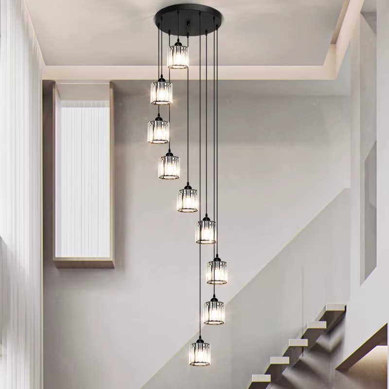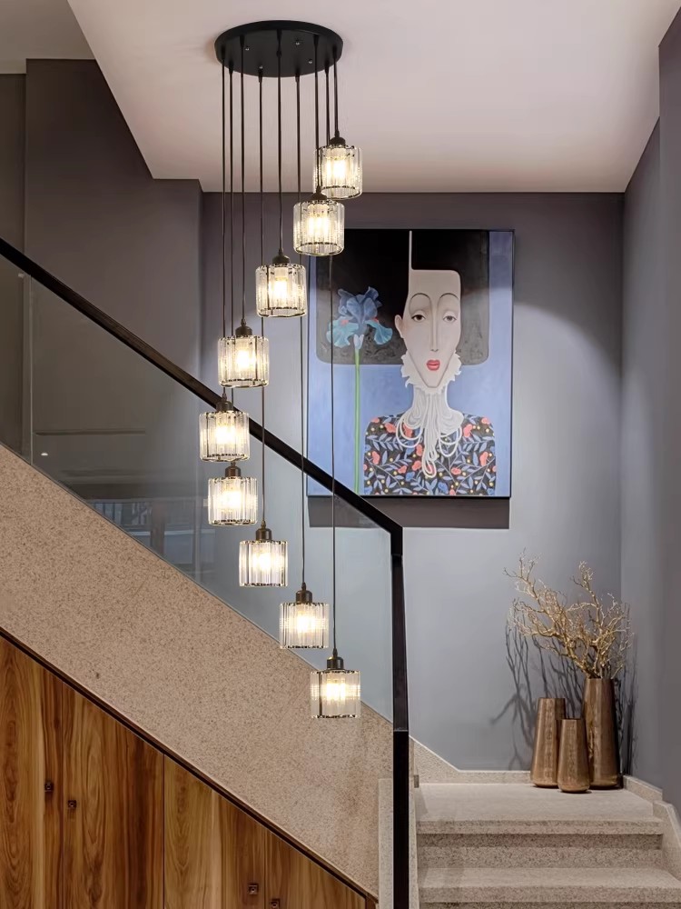 Elevate your multi-level space with the modern elegance of our Nordic Fish Line Crystal Chandelier. This striking fixture features a cascading arrangement of ribbed crystal shades, suspended at staggered heights by thin, durable wires from a sleek iron base, creating a dynamic, waterfall-like silhouette that commands attention. The defining feature is the textured crystal, which diffuses light to produce a soft, ambient glow with a subtle, geometric texture throughout the space. Framed by a spray-painted, frosted iron finish, the fixture is the epitome of Nordic minimalism—ideal for LOFTs, duplex apartments, or grand staircases. As a dedicated lighting manufacturer, we can fully customize the number of shades, wire lengths, and metal finish to perfectly match your project’s scale and style.