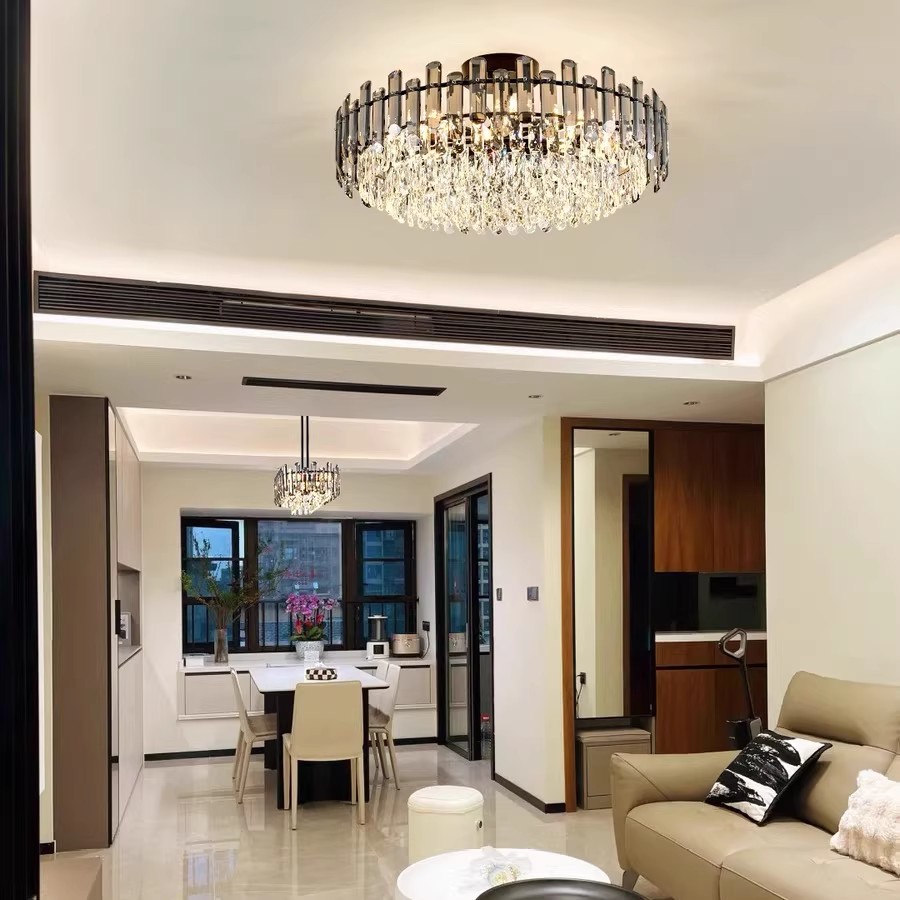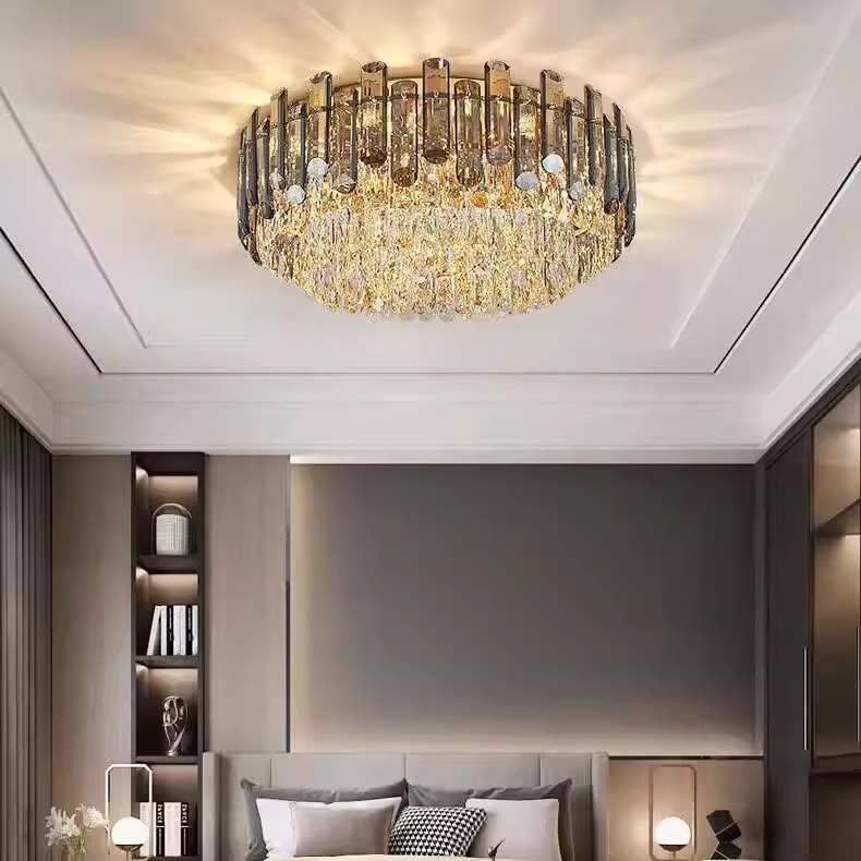 Elevate your interior with the dazzling brilliance of our Luxury Crystal Ceiling Light. This show-stopping fixture features a sleek, circular (or rectangular) frame adorned with layered, smoky gray and clear crystal prisms, creating a luminous, multi-dimensional silhouette that commands attention. The defining feature is the array of precision-cut crystals, which capture and refract internal LED light to produce a sparkling, jewelry-like effect throughout the room. Framed by a polished gold or chrome metal base, the fixture sits flush to the ceiling, making it the epitome of modern glamour—ideal for luxury living rooms, grand dining halls, or high-end hotel lobbies. As a dedicated lighting manufacturer, we can fully customize the shape, crystal colors, and metal finish to perfectly match your project's scale and style.