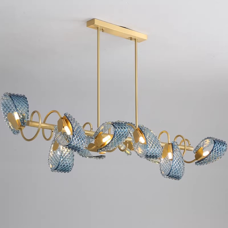 Elevate your interior with the captivating allure of our Blue Textured Glass Chandelier Collection. This show-stopping fixture features a dynamic arrangement of handcrafted, diamond-patterned glass elements in rich blue and translucent teal tones, creating a fluid, organic silhouette that commands attention. The defining feature is the textured glass surface, which captures and refracts internal light to produce a shimmering, aquatic-inspired effect throughout the space. Framed by a polished gold metal structure, the glass elements appear to float effortlessly, making this fixture the epitome of modern artistic luxury—ideal for upscale dining rooms, contemporary living spaces, or high-end commercial interiors. As a dedicated lighting manufacturer, we can fully customize the glass colors, arrangement, and overall dimensions to perfectly match your project’s scale and style.