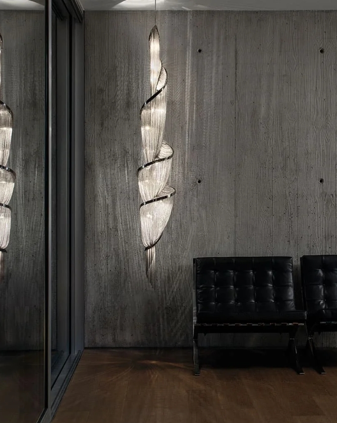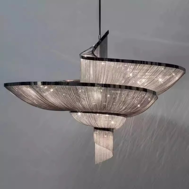 Elevate your interior with the ethereal elegance of our Floating Silk Chandelier. This show-stopping fixture features a fluid, layered arrangement of translucent, silk-like strands, creating a sculptural, cloud-like silhouette that commands attention. The defining feature is the delicate, iridescent strands, which capture and diffuse internal light to produce a soft, ambient glow with a mesmerizing, watercolor-like effect throughout the space. Framed by a sleek black metal edge and suspended by a thin wire, the layered forms appear to float effortlessly, making this fixture the epitome of modern luxury—ideal for dining rooms, living areas, or high-end commercial interiors. As a dedicated lighting manufacturer, we can fully customize the strand colors, arrangement, and overall dimensions to perfectly match your project’s scale and style.