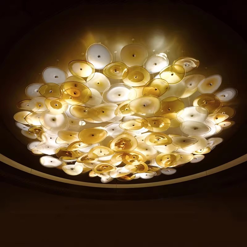 Elevate your interior with the artistic allure of our Artistic Glass Disc Chandelier. This show-stopping fixture features a dynamic, organic arrangement of translucent glass discs in warm amber and clear tones, creating a cascading, cloud-like silhouette that commands attention. The defining feature is the handcrafted glass elements, which capture and diffuse internal light to produce a soft, ambient glow with a mesmerizing, watercolor-like effect throughout the space. Suspended from a sleek ceiling mount, the layered discs appear to float effortlessly, making this fixture the epitome of modern artistic design—ideal for luxury hotel lobbies, upscale restaurants, or contemporary commercial interiors. As a dedicated lighting manufacturer, we can fully customize the disc colors, arrangement, and overall dimensions to perfectly match your project’s scale and style.