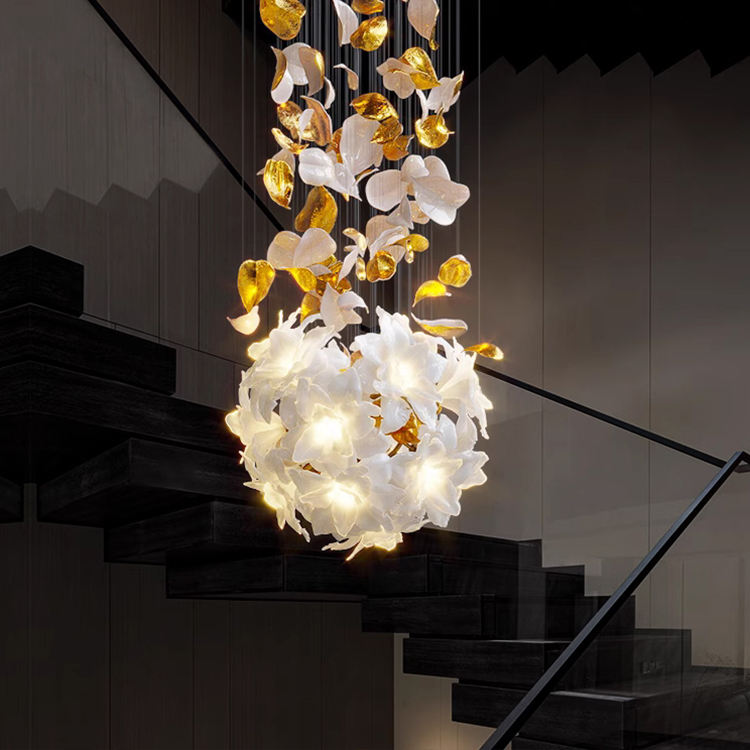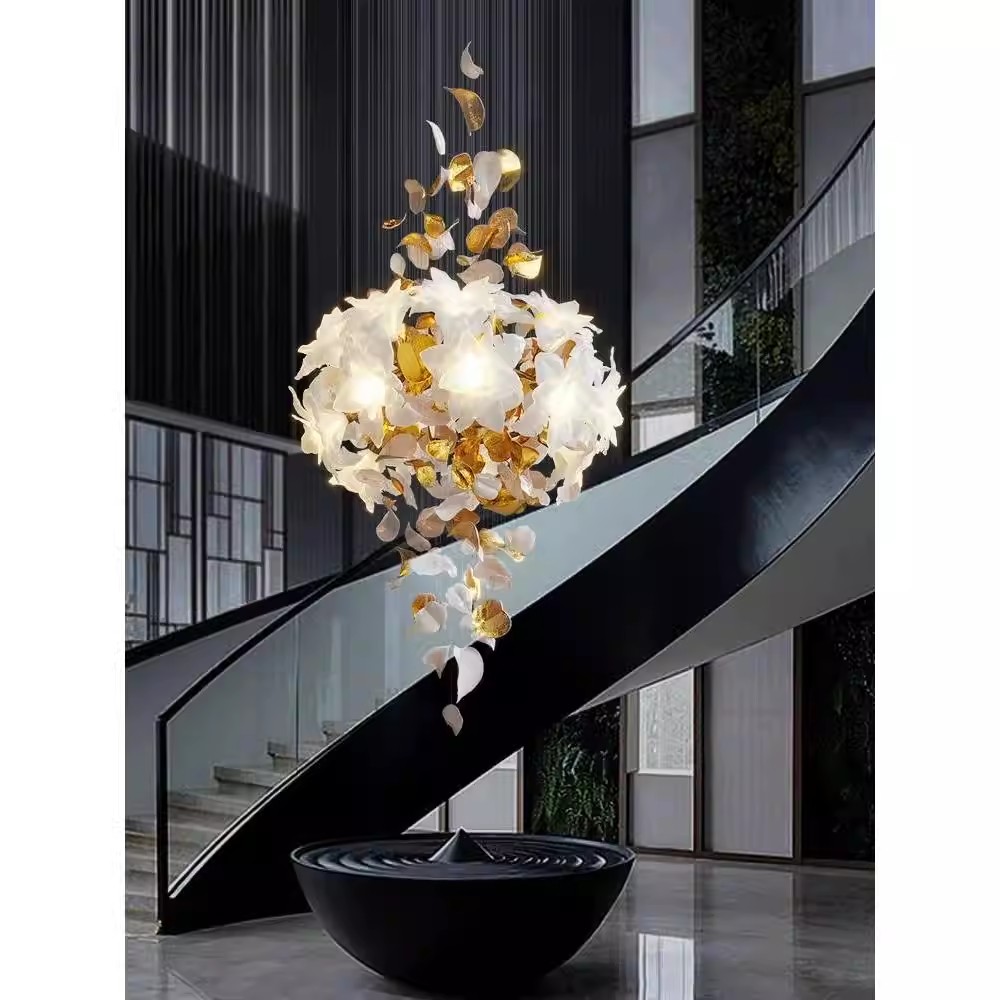 Elevate your multi-level space with the enchanting allure of our Blooming Splendor Floral Chandelier. This show-stopping fixture features a cascading, organic arrangement of delicate frosted white glass blossoms, supported by curving gold-toned metal branches, creating a luminous, nature-inspired silhouette that commands attention. The defining feature is the milky white glass petals, which diffuse internal LED light to produce a soft, ambient glow with a mesmerizing, blooming effect throughout the space. Suspended from a sleek, polished ceiling plate, the fixture is the epitome of artistic luxury—ideal for grand staircases, LOFTs, or duplex apartments. As a dedicated lighting manufacturer, we can fully customize the number of blossoms, branch arrangement, and metal finish to perfectly match your project’s scale and style.