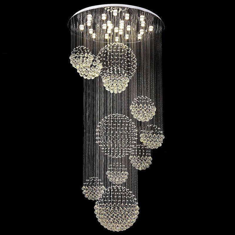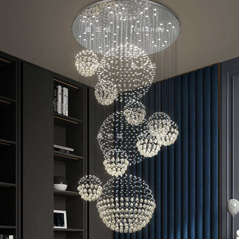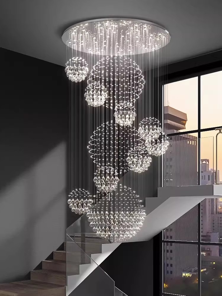 Elevate your multi-level space with the breathtaking elegance of our Cascading Crystal Orb Chandelier. This show-stopping fixture features a dynamic, swirling arrangement of luminous crystal orbs, suspended at staggered heights by thousands of thin, transparent wires from a sleek circular ceiling plate, creating a luminous, organic silhouette that commands attention. The defining feature is the precision-cut crystal, which captures and refracts internal LED light to produce a dazzling, star-like effect throughout the space. Framed by a polished metal base, the fixture is the epitome of modern luxury—ideal for grand staircases, LOFTs, or duplex apartments. As a dedicated lighting manufacturer, we can fully customize the number of orbs, wire lengths, and metal finish to perfectly match your project’s scale and style.