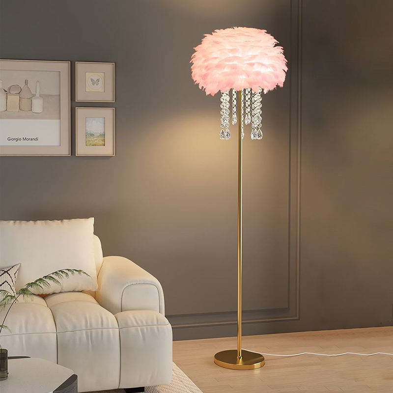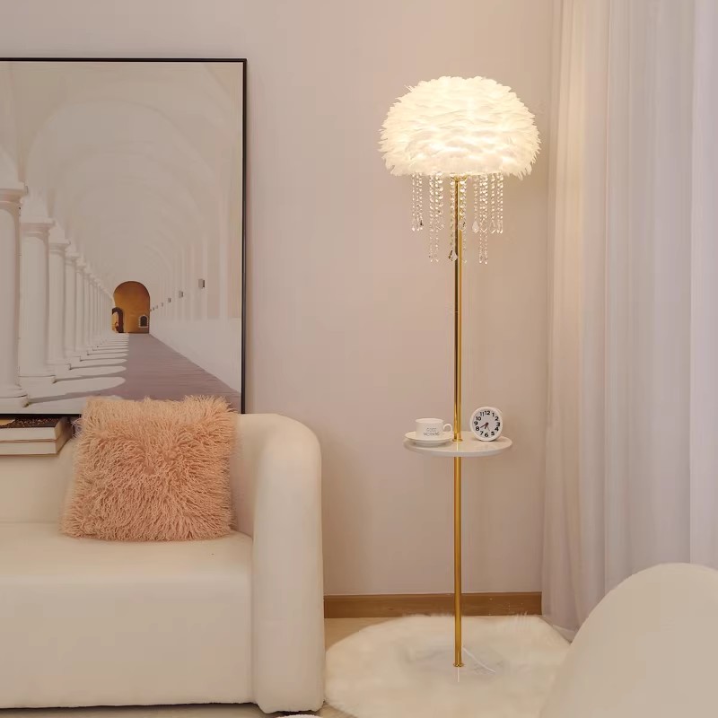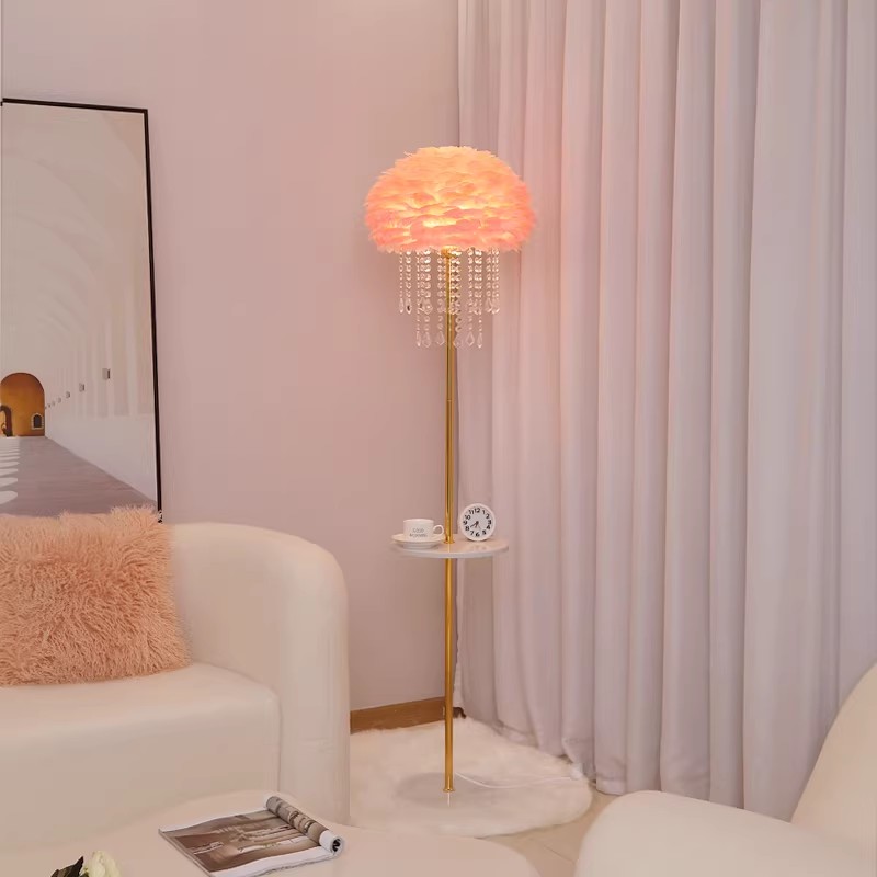 Elevate your living space with the dreamy elegance of our Feather & Crystal Floor Lamp. This show-stopping fixture features a voluminous shade crafted from soft white feathers, adorned with cascading crystal pendants, creating a luminous, cloud-like silhouette that commands attention. The defining feature is the combination of feather and crystal, which diffuses internal light to produce a warm, ambient glow with a delicate, ethereal effect throughout the space. Paired with a sleek gold-toned metal stem and an integrated side table, it balances aesthetic charm and functional design. Equipped with a wired power supply and convenient switch control, this lamp is the epitome of modern luxury—ideal for adding a touch of romance to living rooms, bedrooms, or entryways. As a dedicated lighting manufacturer, we can fully customize the finish to perfectly match your decor.