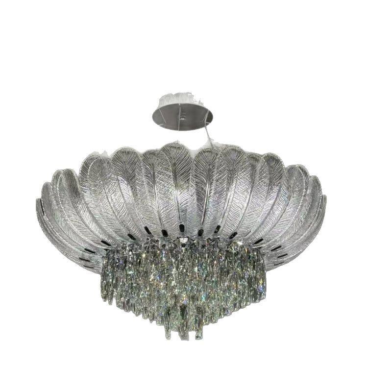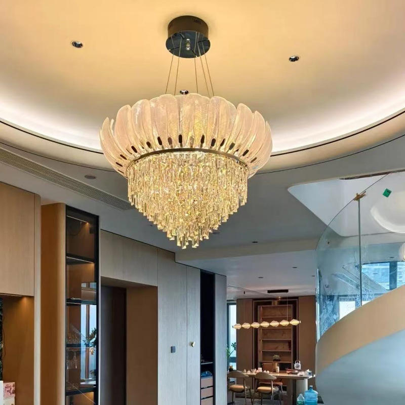 Elevate your interior with the ethereal allure of our Modern Luxury Custom Feather Glass Crystal Chandelier. This breathtaking fixture features a circular, crown-like design, crafted from intricately textured, feather-shaped glass panels that form a delicate, layered silhouette. Cascading from the center is a dense cluster of clear, faceted crystal rods, which refract light to cast a warm, ambient glow. The organic, nature-inspired design seamlessly integrates with a wide range of decor styles, from modern luxury to contemporary sophistication. Ideal for high-end hotels, opulent villas, and grand dining rooms, this custom chandelier is a striking focal point that transforms ordinary spaces into extraordinary experiences. As a dedicated lighting manufacturer, we specialize in non-standard customization—from dimensions and shape to color and finish—to perfectly match your project’s unique vision. This statement chandelier delivers timeless style and unparalleled craftsmanship, making it the ultimate choice for creating unforgettable first impressions.