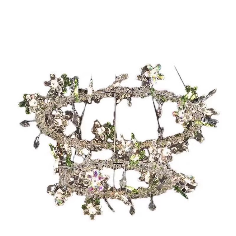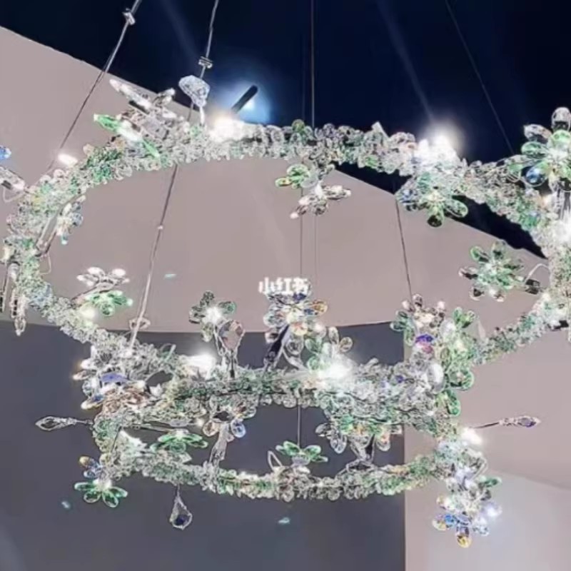 Elevate your modern living space with the ethereal luxury of our Crystal Floral Ring Chandelier . This exquisite fixture features a delicate, layered ring design, adorned with intricate crystal flowers, vines, and teardrop pendants that catch and refract light to create a soft, luminous glow. The integrated LED lights emit a warm, inviting illumination, while the crystal details add a touch of glamour and sophistication. With a wide voltage range of 111V-240V, it is perfectly compatible with North American electrical systems. Ideal for living rooms, bedrooms, and dining areas, this chandelier transforms any space into a dreamy, elegant retreat, blending modern luxury with a whimsical, nature-inspired aesthetic.