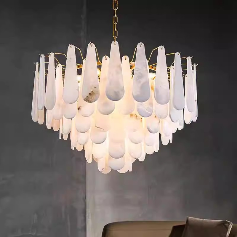 Elevate your modern living space with the understated luxury of our Modern Branch Chandelier. This designer fixture features a solid brass frame, adorned with cascading teardrop-shaped natural alabaster pendants that diffuse light into a soft, warm glow. The layered branch structure creates a striking, organic silhouette, blending post-modern sophistication with timeless elegance. With a wide voltage range of 111V-240V, it is perfectly compatible with North American electrical systems. Ideal for living rooms, dining areas, and bedrooms, this chandelier transforms any space into a sophisticated retreat, merging premium materials with artistic design to become a captivating focal point.