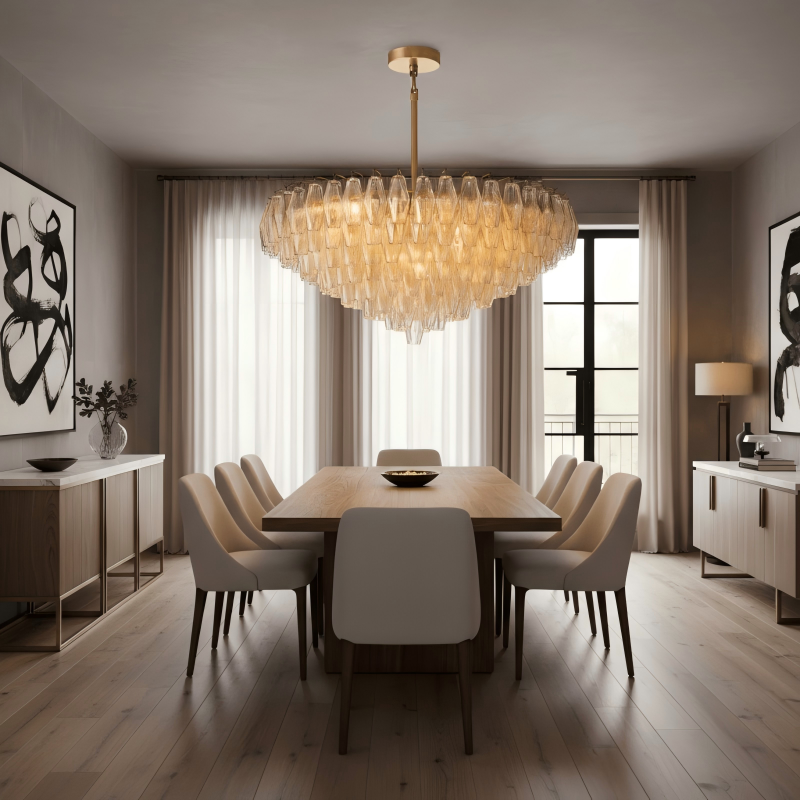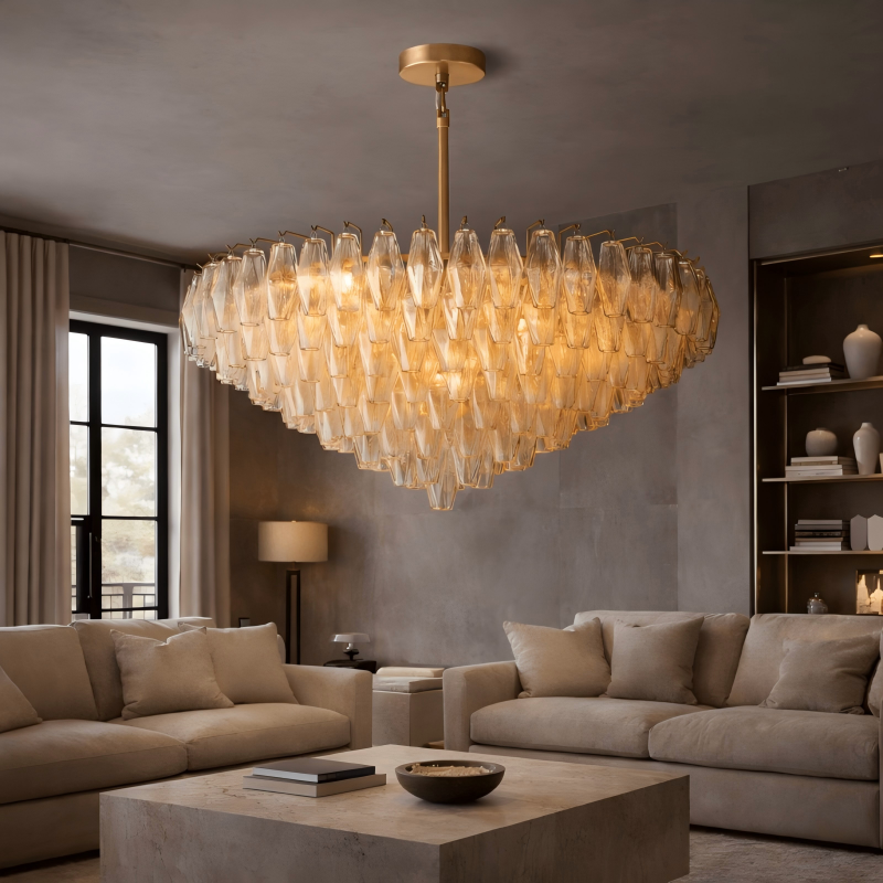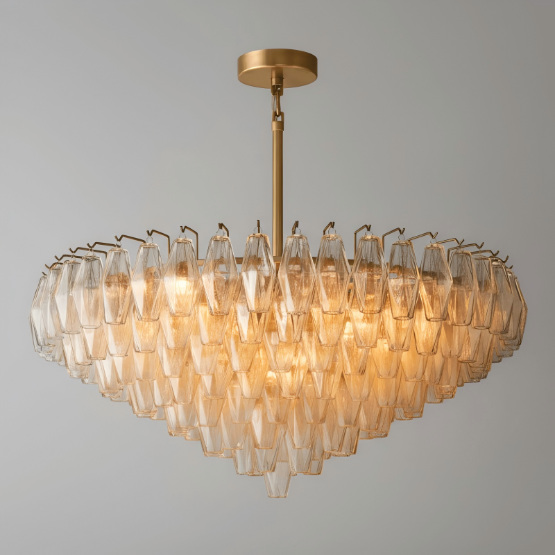 This chandelier features a brass-finished metal frame, paired with multiple layers of staggered amber-tinted faceted glass shades, forming a full inverted conical silhouette. The metal frame boasts a warm and elegant texture, while the glass shades diffuse a soft, warm amber glow when illuminated. It retains the crispness of modern luxury while embodying the opulence and ceremonial charm of classic chandeliers. Ideal for hotels, villas, ballrooms, living rooms, and more, it effectively elevates the luxurious style and atmospheric appeal of any space.