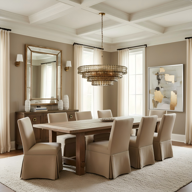 This chandelier features a brass-finished metal frame with layers of staggered smoky amber wavy glass. The glass emits a soft, warm glow when lit, combining modern luxury with classic elegance. It is ideal for living rooms, dining rooms, entryways, or restful retreats,enhancing the luxurious atmosphere of any space.