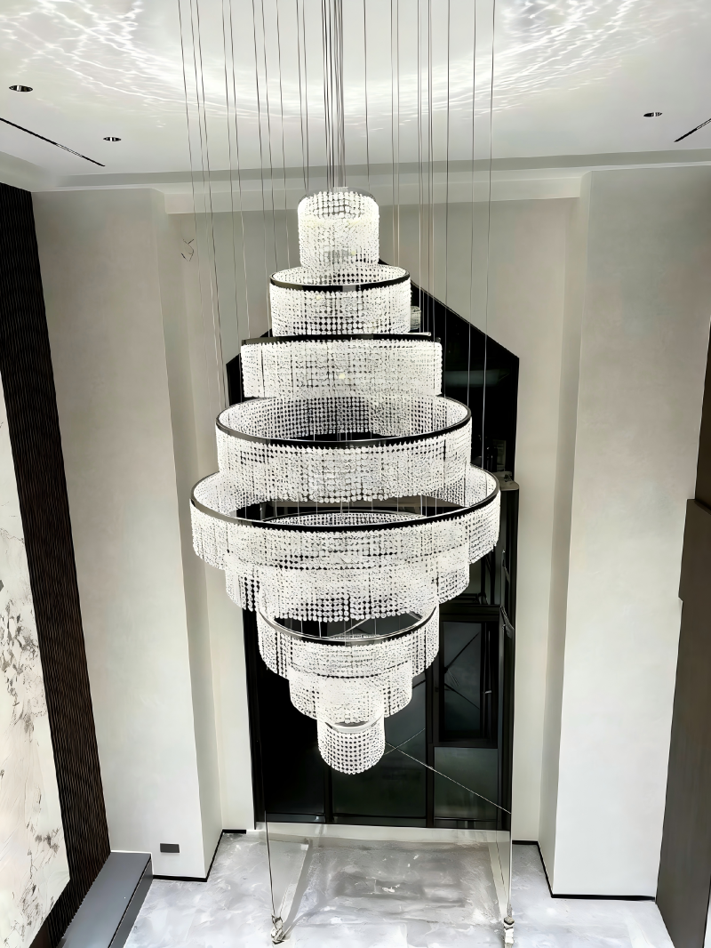 This multi-tier crystal chandelier features a polished chrome metal frame, paired with cascading layers of clear faceted crystals to form a grand stepped silhouette. The sleek silver-toned metal frame delivers a refined modern sheen, while the crystals refract light into a brilliant iridescent glow. Blending contemporary luxury with timeless crystal opulence, it is designed for high-ceilinged spaces, making it a stunning focal point for villas, hotel lobbies, and duplex living rooms to elevate the space’s luxurious ambiance.