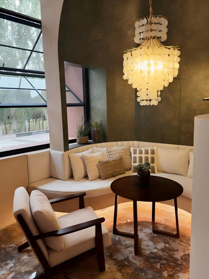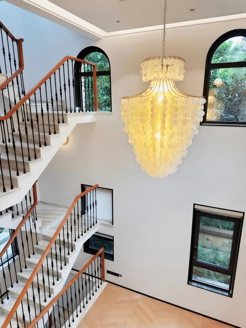 Embodying the timeless charm of French Mid-Century Modern style, this opulent chandelier features cascading layers of natural capiz shell discs. The warm brass-toned metal frame complements the shells' soft pearlescent glow, creating a dreamy, romantic ambiance. Perfect for adding a touch of sophisticated vintage elegance to your living room, dining area, or bedroom.