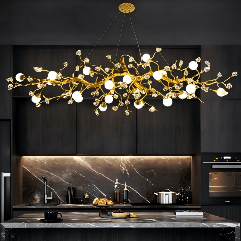 The chandelier is ideal for installation above a dining table or kitchen island, where its horizontal spread creates balance, presence, and architectural elegance. The warm gold finish pairs beautifully with marble, wood, and contemporary interiors-making it a sophisticated centerpiece for modern homes.