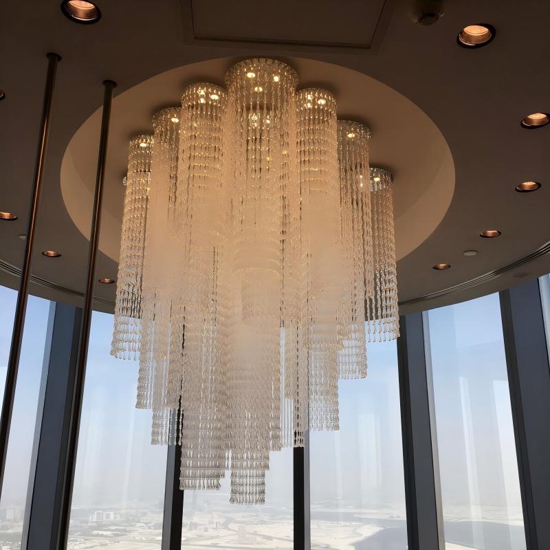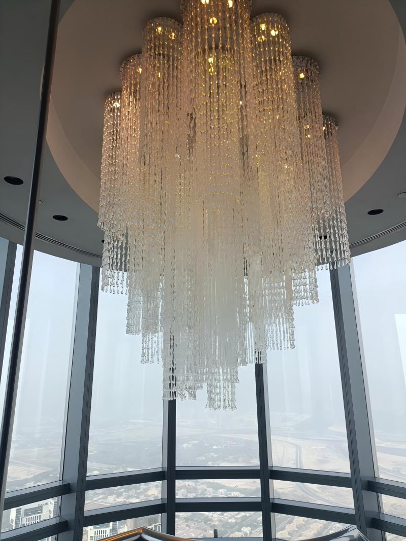 This long cascading crystal LED chandelier features layers of transparent crystal beads and teardrop pendants, cascading down from the high-altitude ceiling to form a luminous visual waterfall in the spiral staircase. The polished metal base complements the transparent crystal, while warm LED light refracts through the crystal to create a dazzling glow. Embodying Dubai’s luxurious design language, its modern minimalist vertical lines illuminate high-ceilinged spaces, making it a highly recognizable artistic statement in upscale hotels, duplex staircases, and luxury clubs.