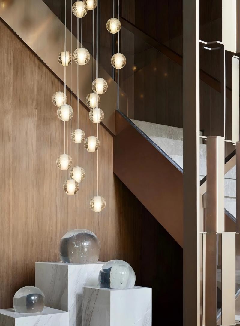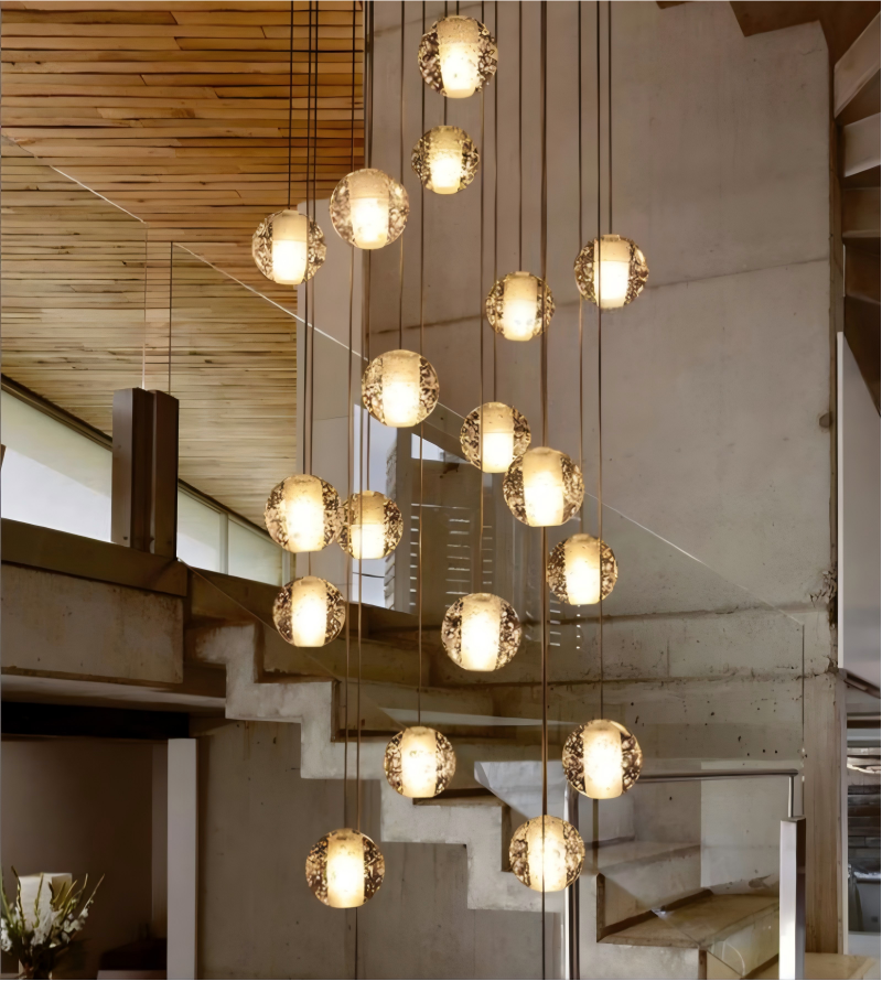 This bubble glass staircase chandelier features dozens of hand-blown clear bubble glass spheres, whose irregular internal bubble textures cast a dreamy glow when light refracts through. Thin stainless steel wires suspend the glass spheres in a staggered arrangement, paired with a silver metal base. It retains the crisp minimalism of modern design while infusing a dynamic natural artistic texture, making it a highly atmospheric focal point in duplex staircases, high-ceilinged living rooms, and upscale hotel lobbies, endowing vertical spaces with a light and transparent luxurious tone.