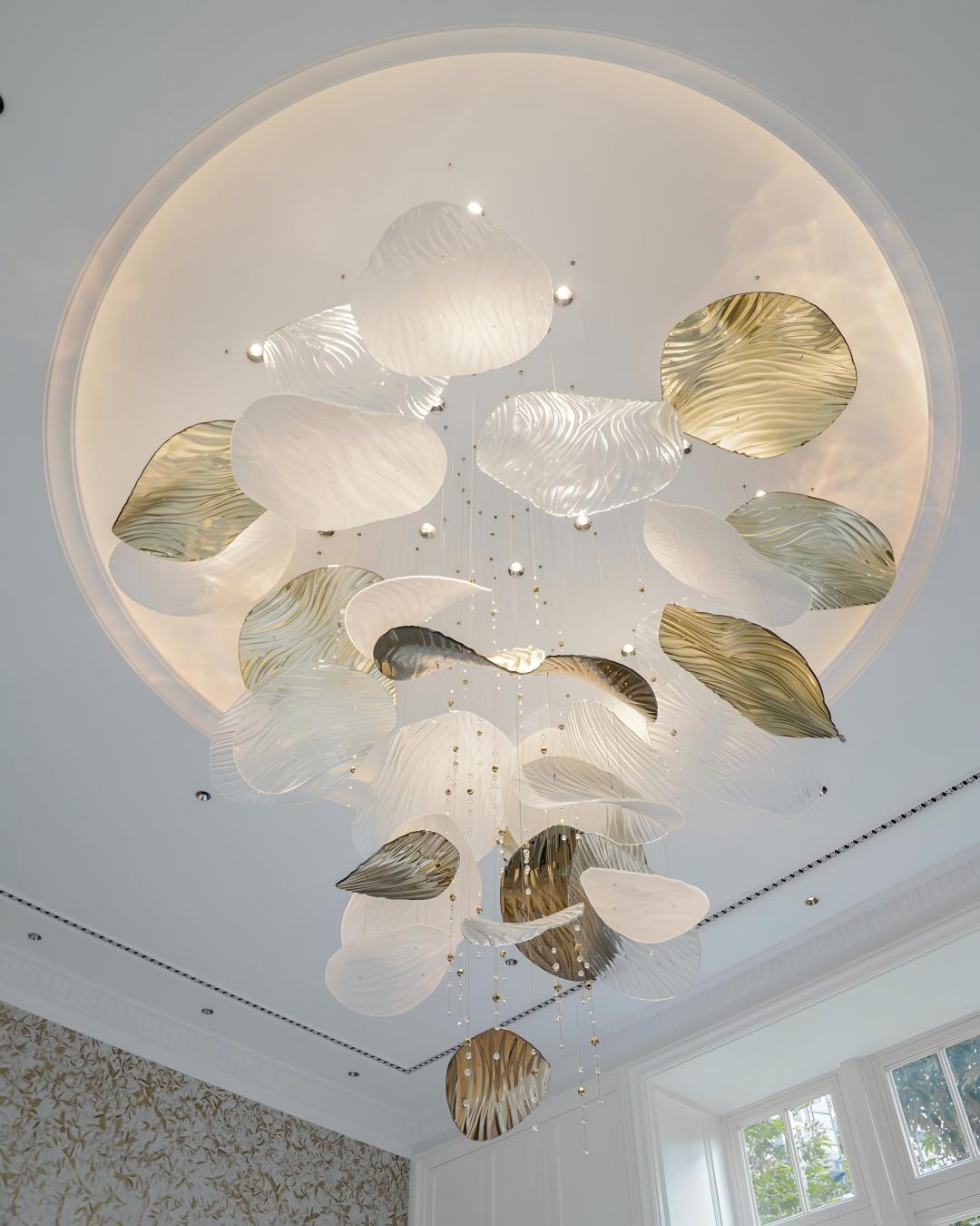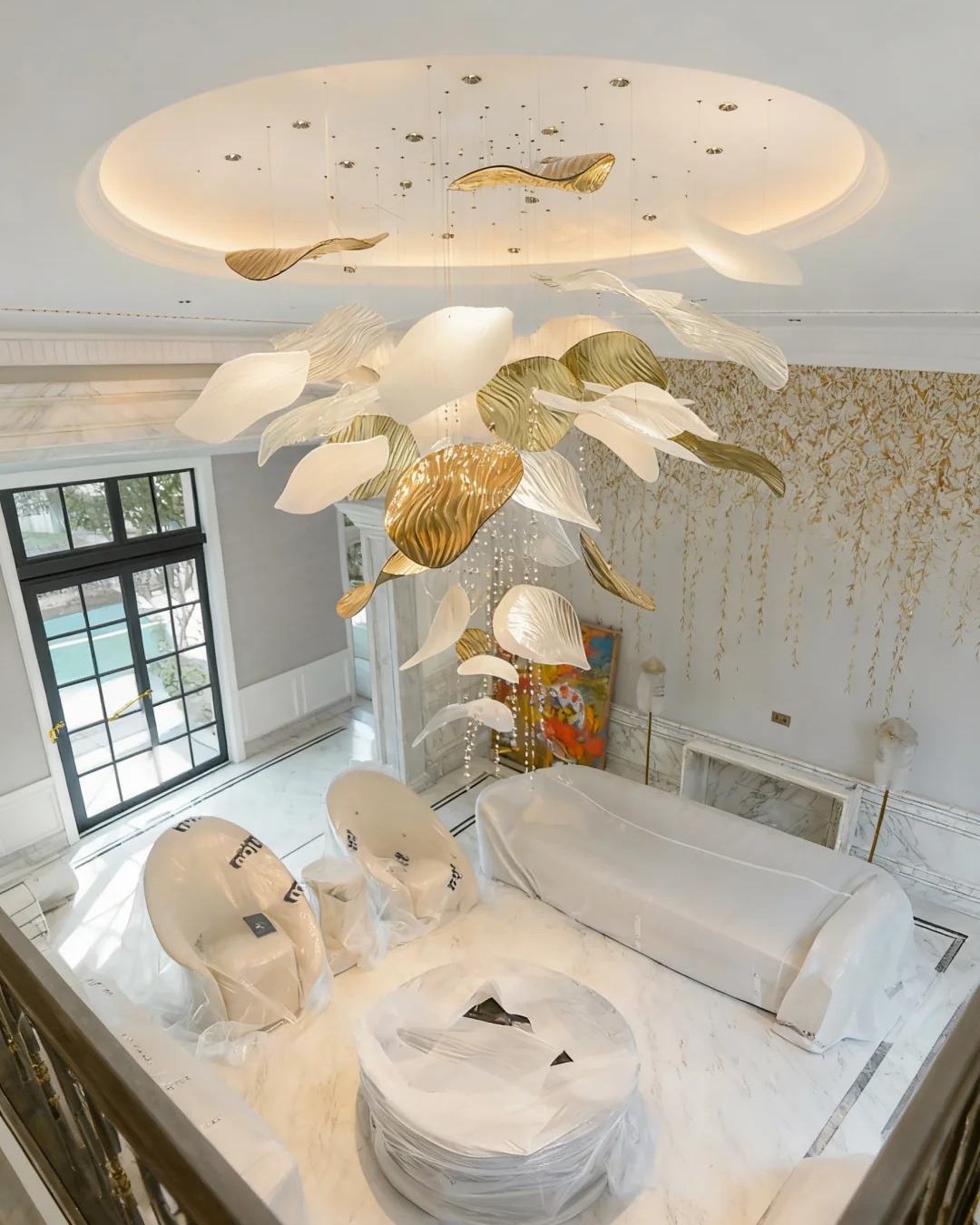 This modern organic leaf art chandelier features dozens of hand-blown ripple-textured art glass leaves in milky white, clear, and amber-gold, cascading in a staggered arrangement like floating leaves or swimming fish. Suspended by thin stainless steel wires alongside crystal bead strings, light emanates from the light source in the ceiling base, refracting through the textured glass to cast a soft glow. It perfectly blends natural vitality with Italian luxury, making it a highly atmospheric focal point in high-ceilinged living rooms, villa staircases, and upscale hotel lobbies, endowing the space with a light and transparent artistic charm.