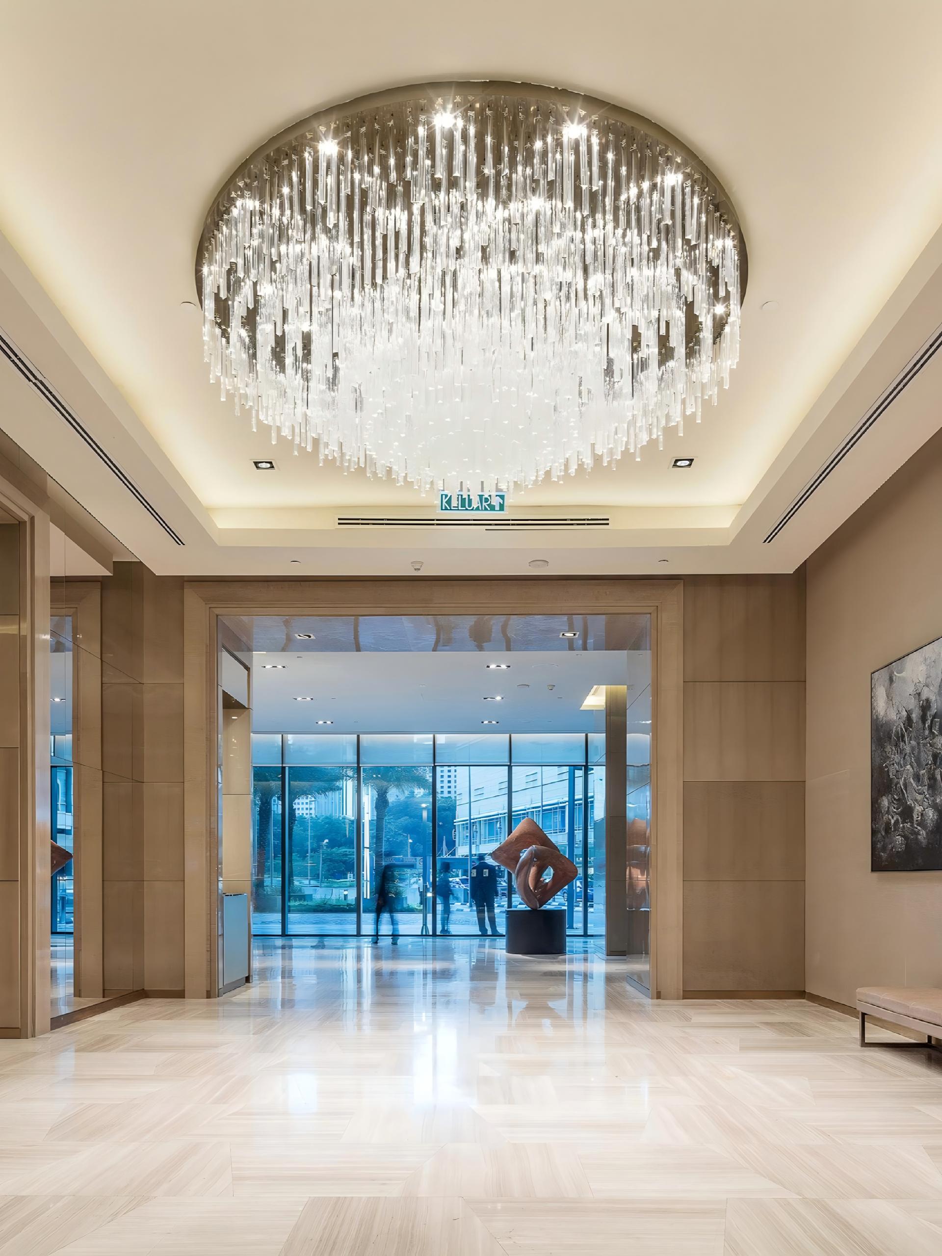 This luxury classic crystal chandelier features hundreds of transparent elongated crystal rods hanging vertically in a neat, circular cloud-like cascade. Light emits from the central LED source, refracting and reflecting through the crystal rods to create a dazzling and brilliant glow. The antique bronze or champagne gold metal base and frame exude a stable and elegant charm, perfectly blending the gorgeousness of crystal with the texture of metal. As an iconic decorative fixture in high-end hotel lobbies, luxury villa entrances, and five-star clubs, it creates a solemn, elegant, and luxurious spatial charm through ultimate light and shadow.