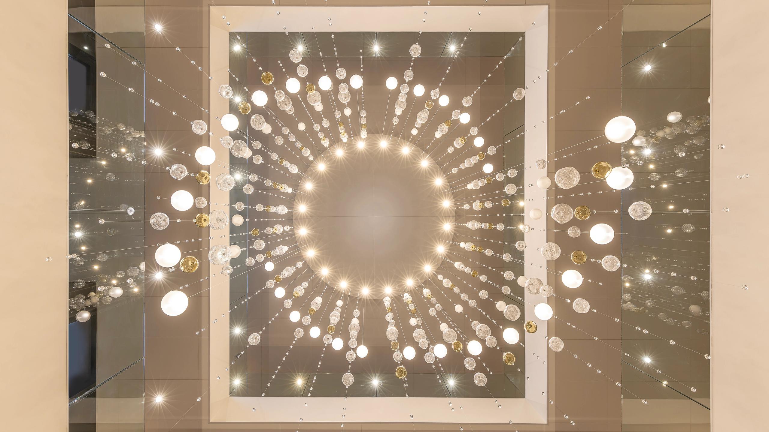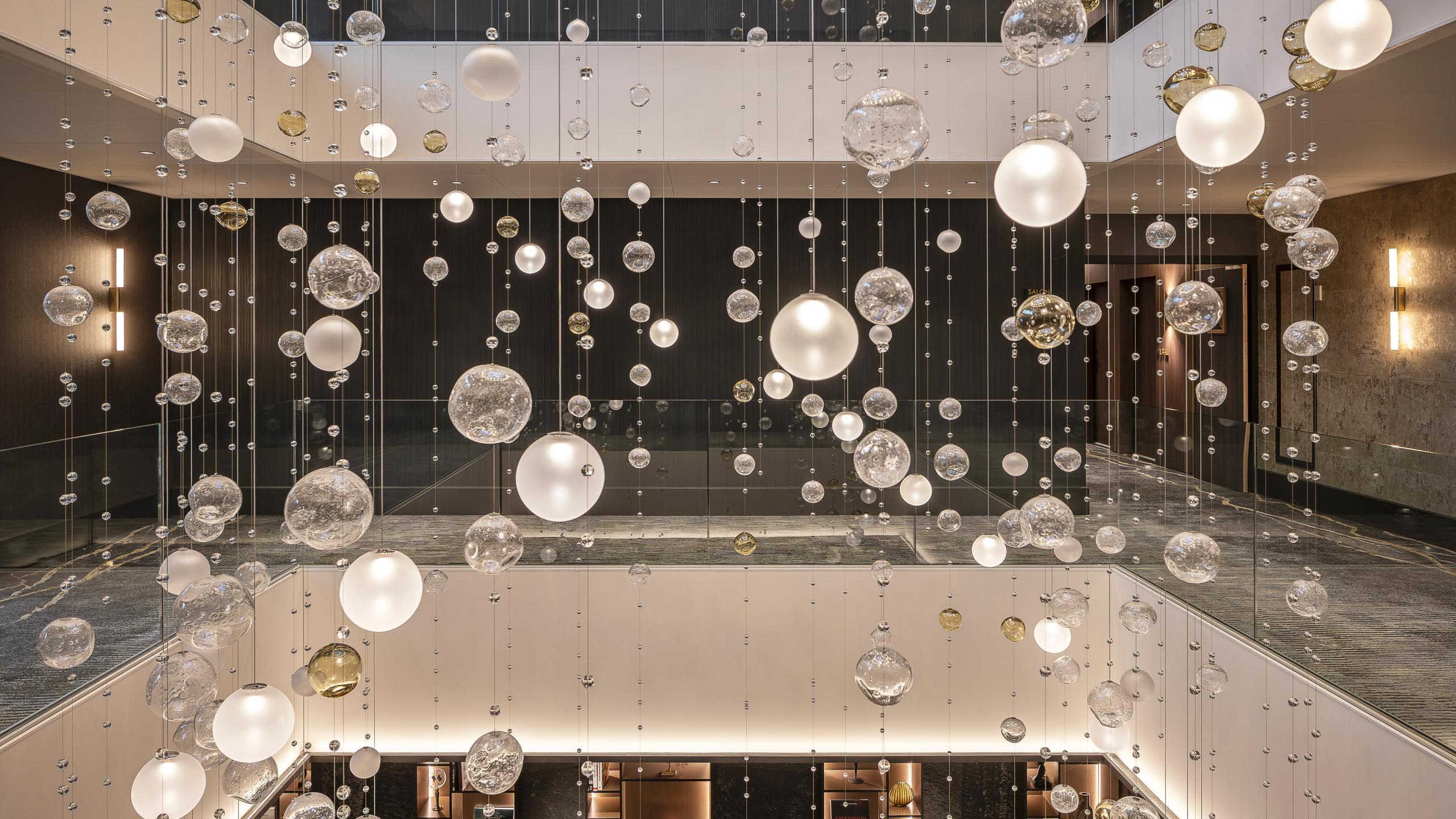This bespoke pendant lighting unfolds like a cascade of glistening water pearls. Crafted from hand-blown glass elements in crystal clear, sandblasted bubble, and soft light amber finishes, these orbs descend gracefully from the ceiling toward the reception area below, shimmering with delicate, ethereal light. It merges the fluidity of nature with minimalist luxury, creating a light, transparent, and dreamlike atmosphere that elevates high-ceilinged spaces into a visual spectacle.