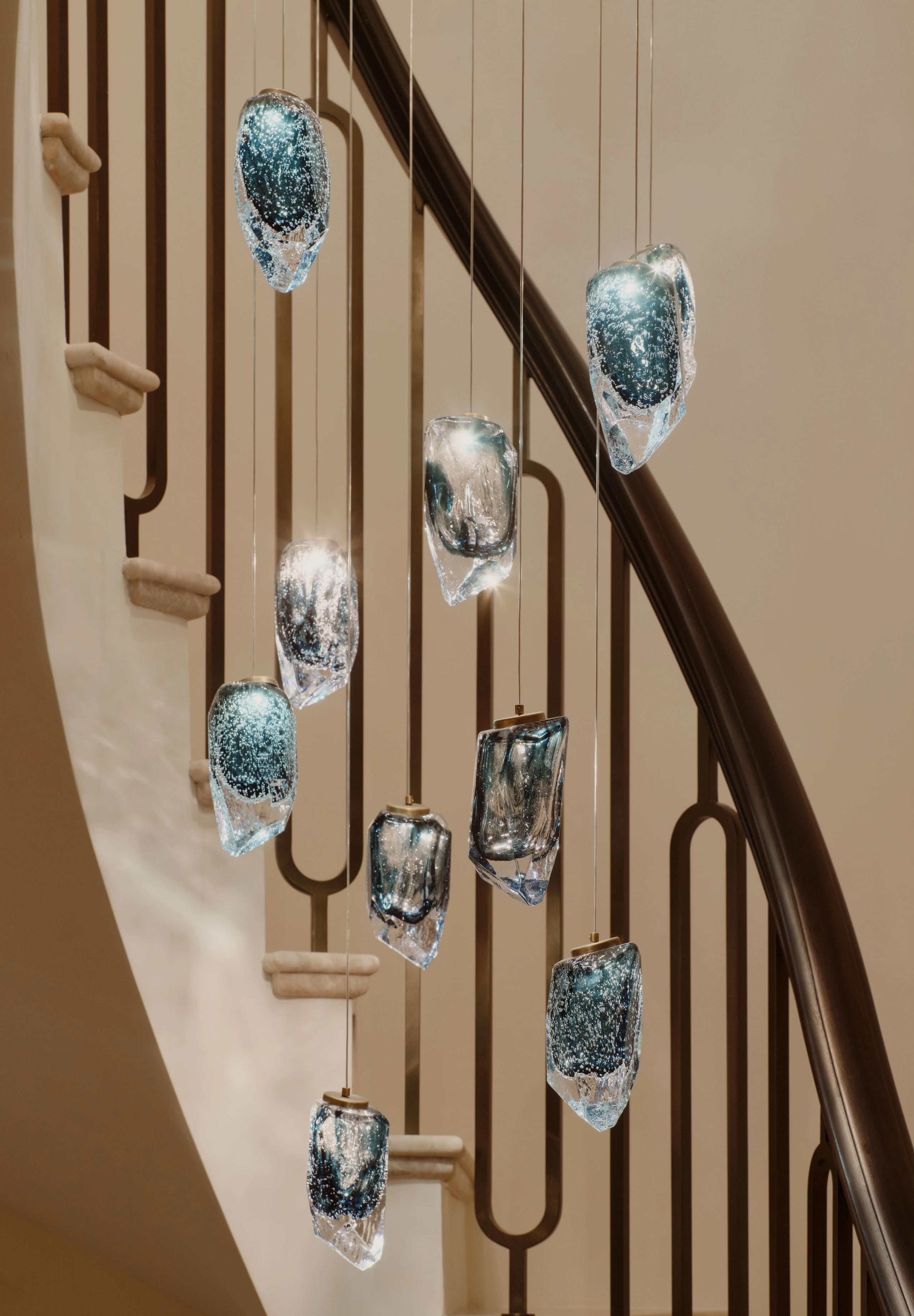This Staircase Lighting features hand-blown soda-finished glass as its core, with a translucent lagoon mist hue that diffuses a gentle, water-wave-like glow under light. The internal bubble texture shimmers with light and shadow, resembling suspended ice crystals and flowing mist. Suspended by transparent nylon wires and anchored with brass gold metal caps, the glass pendants hang like stars over duplexes, villas, and staircases, infusing high-end spaces with a naturally dynamic, luxurious and elegant artistic atmosphere.
