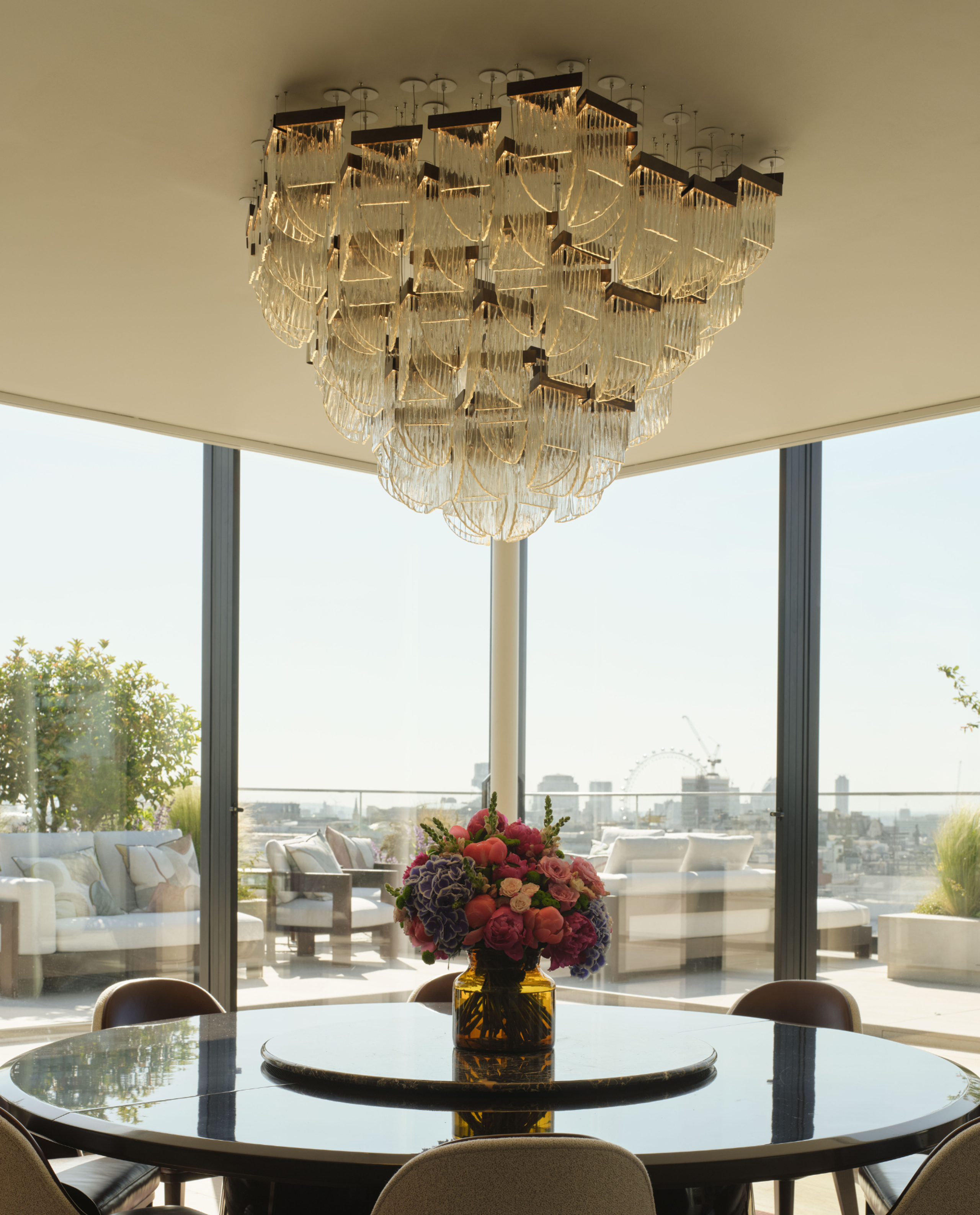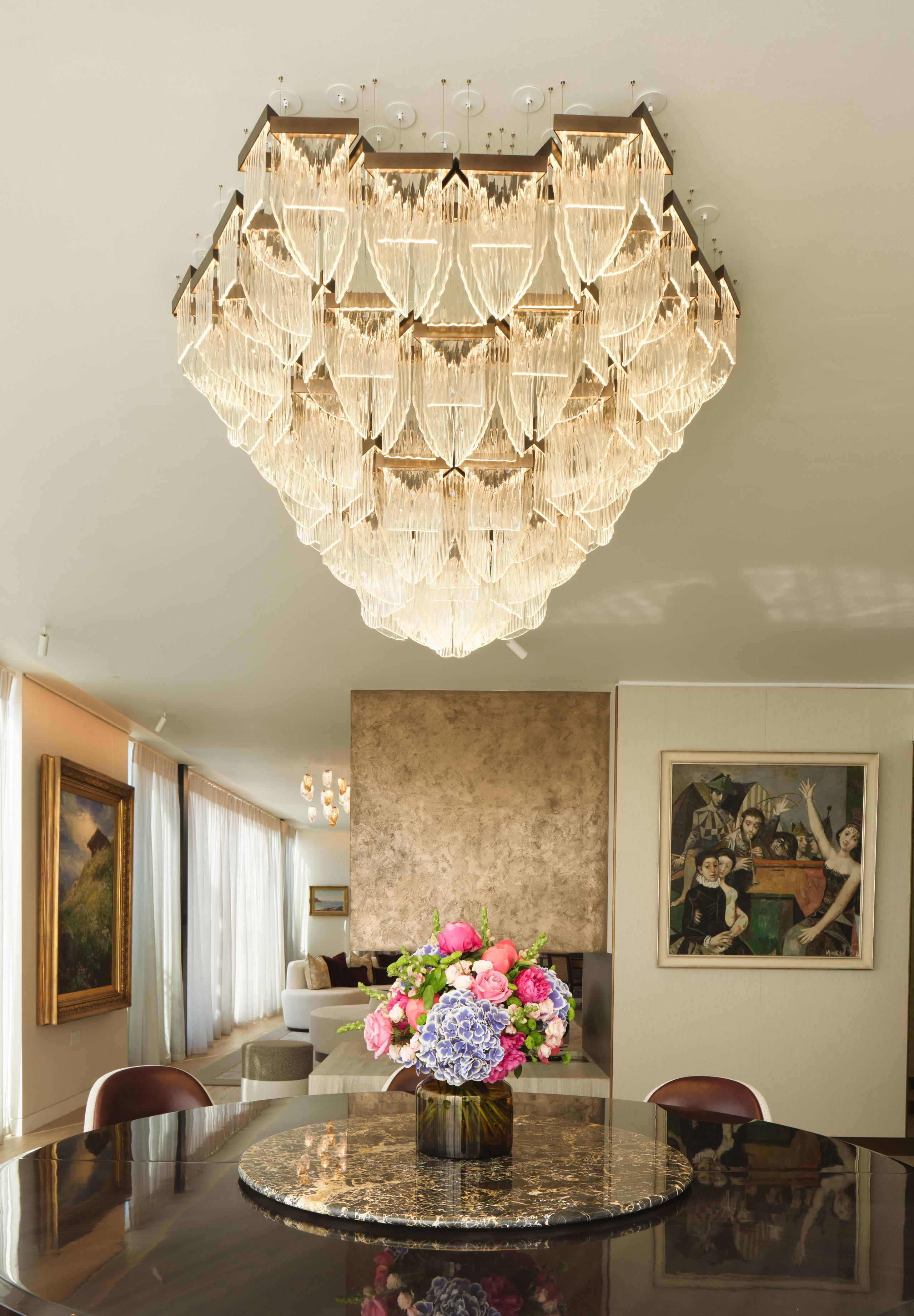 This is a custom artistic chandelier made of high-quality slumped glass. The glass lampshades feature an organically cut shape and delicate texture, forming a bold geometric structure with a strong sculptural sense. It uses LED light source, soft and glare-free, casting elegant light and shadow reflections. With modern artistic style, this chandelier is ideal for dining rooms, hotel lobbies, banquet halls and luxury villas, serving as an eye-catching decorative centerpiece that combines modern aesthetics and artistic ambiance.