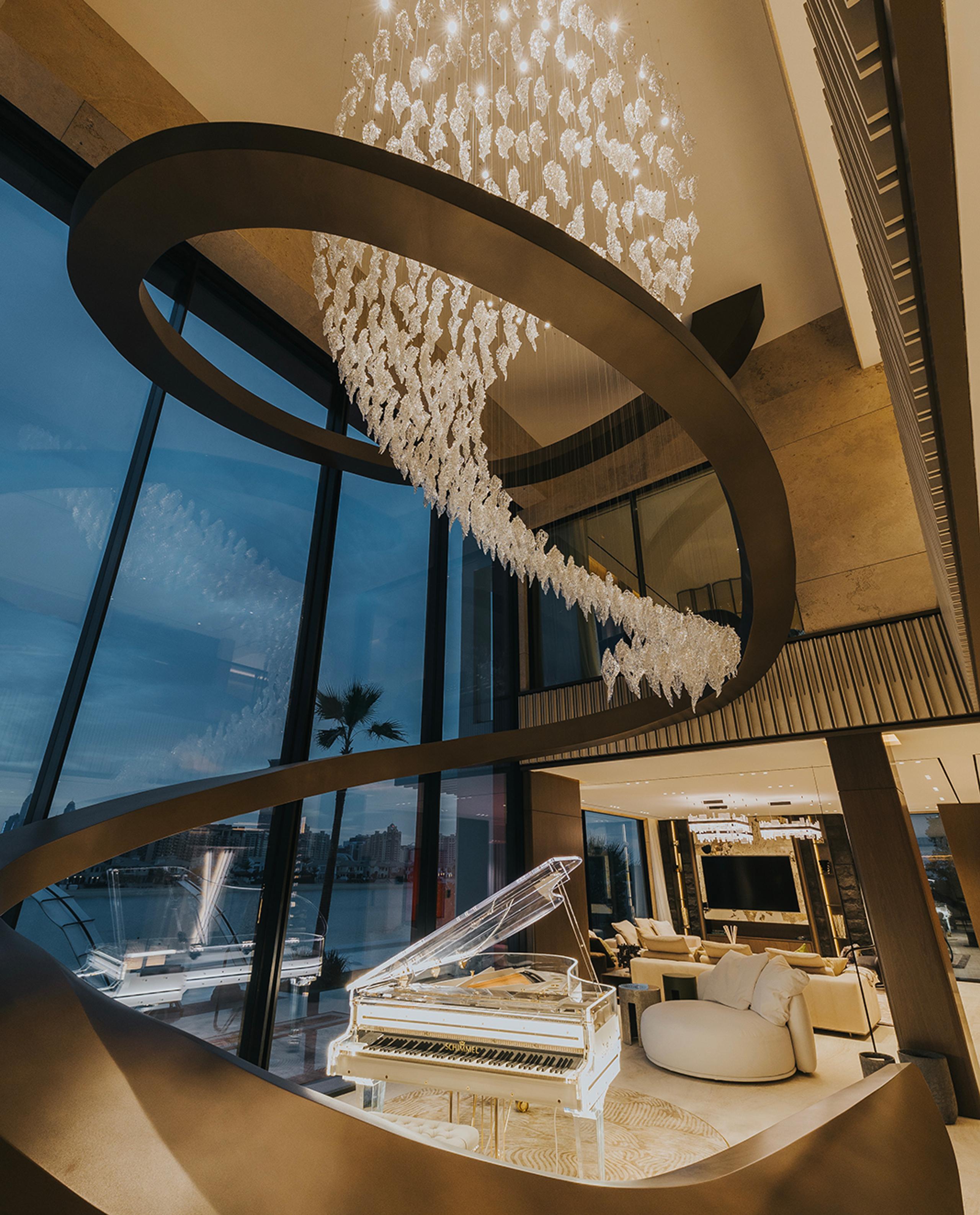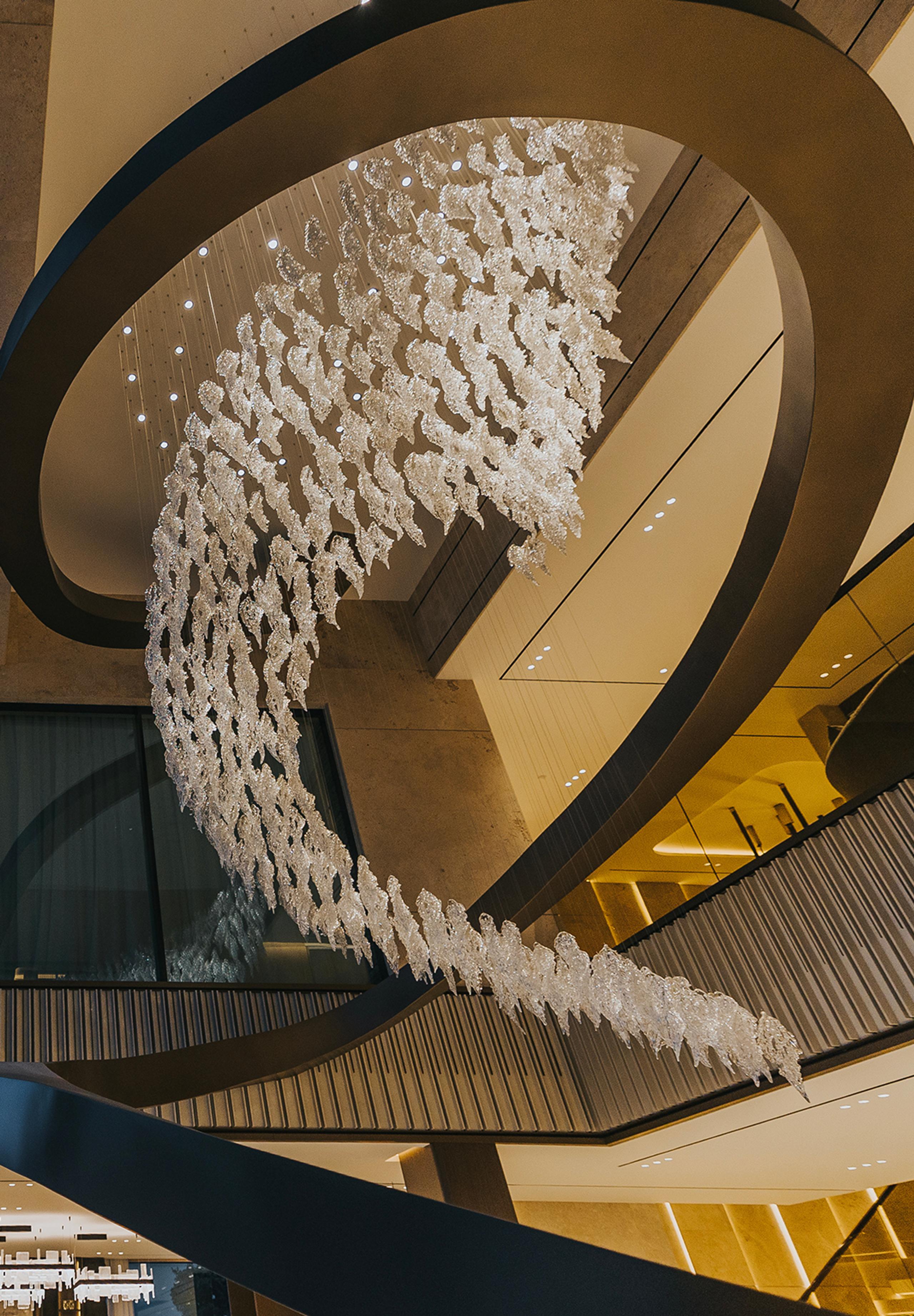 This chandelier features hand-blown crystal-colour art glass, meticulously crafted to mimic the textured look of frost-covered foliage. Suspended from a stainless-steel finished structure in a custom swirling formation, each glass component creates a dynamic vertical flow that draws the eye upward through the atrium. Blending artisanal craftsmanship with modern finishing techniques, it evokes the ethereal beauty of snow-covered leaves from a fairy tale, serving as the ultimate luxurious centrepiece for high-end villas and hotel lobbies, casting an elegant, dreamy ambiance with every play of light.