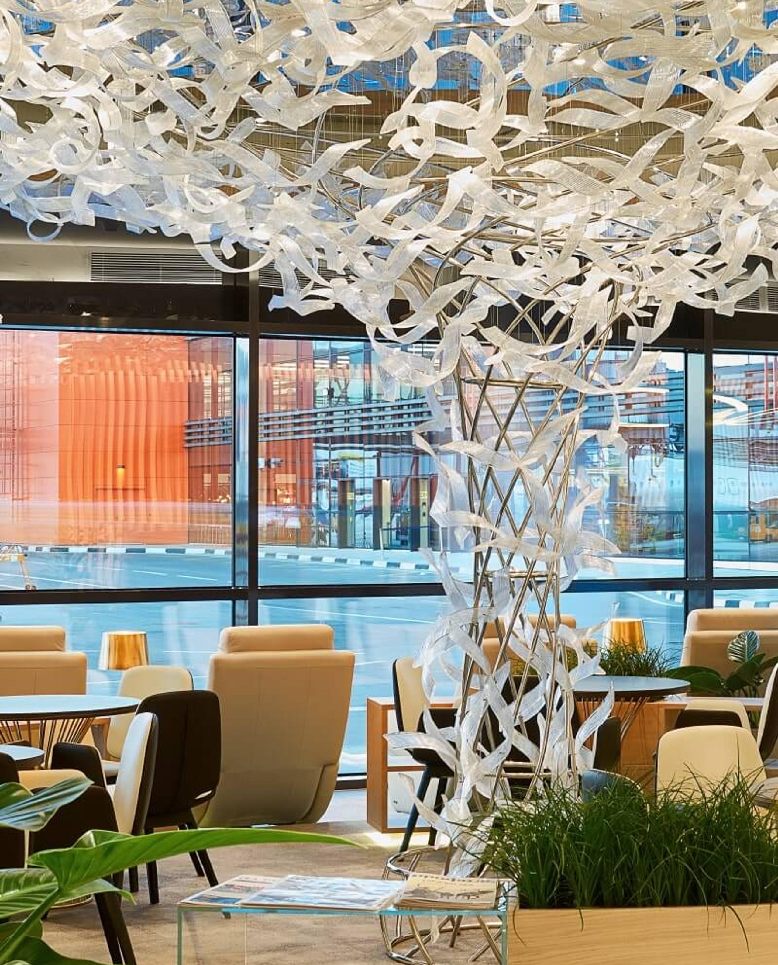 This futuristic modern art installation chandelier stands as the ultimate showstopper for high-end commercial and hospitality interiors. Composed of hundreds of ribbed, crystal-clear glass ribbons, each lampshade is precision shaped through hot-bending technology to mimic the graceful flow of clouds or the branches of a majestic tree of life. The transparent crystal material refracts light into brilliant, ice-like radiance, creating a stunning visual spectacle. Supported by a polished stainless steel frame and invisible clear wires, the entire design exudes a sense of weightlessness and elegance. With its cool white and silver color palette, clean lines, and sculptural presence, this fixture embodies the perfect blend of organic modernism and minimalist luxury. It transforms ordinary spaces—from airport lounges to exclusive hotel lobbies—into immersive environments where light, art, and architecture converge to create an unforgettable focal point.